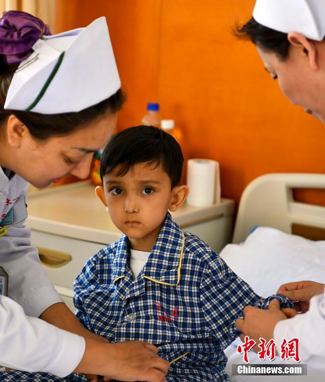 5月8日,新疆医科大学第一附属医院,护士正在为来自阿富汗的先天性心脏病患儿伽卫达(音译)整理病号服。5岁的伽卫达已完成心脏免费治疗手术,明日他将带着医院为其准备的免费药品跟随家长返回阿富汗静养。另一名患儿仍在术后留院观察中。至此,2018年度首批来华的25名阿富汗先心病患儿已全部完成免费治疗。据介绍,4月18日,阿富汗25名先心病患儿和其家长,在中国红十字援外医疗队的陪同下,从阿富汗喀布尔乘坐航班飞抵中国新疆,22名已完成手术治疗的患儿及1名不宜手术的患儿,已于4月25日,5月2日分两批返回阿富汗。中新社记者 刘新 摄