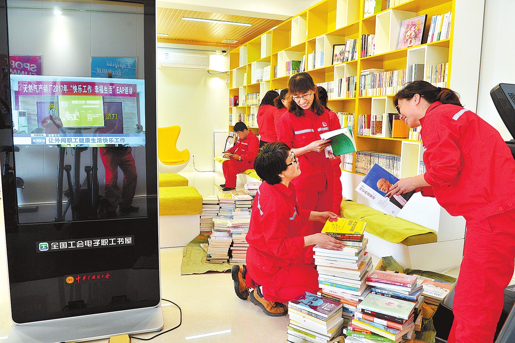 5月14日,中原油田的职工在整理、阅读书籍。该油田精选职工感兴趣的各类书籍,创建了职工书屋、读书角,将其打造成提升员工文化素质的充电站,引导职工从“阅读”变“悦读”。来源:河南日报 马洪山摄