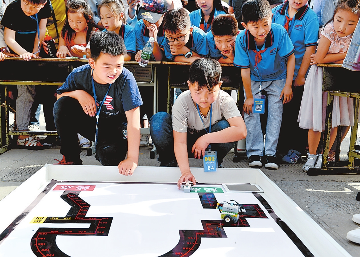 5月13日,夏邑县中学生在该县举办的首届“超创杯”青少年机器人技能对抗交流赛上竞技。此次比赛共448人参加,激发了广大青少年学习科技知识的兴趣。来源:河南日报 苗育才摄