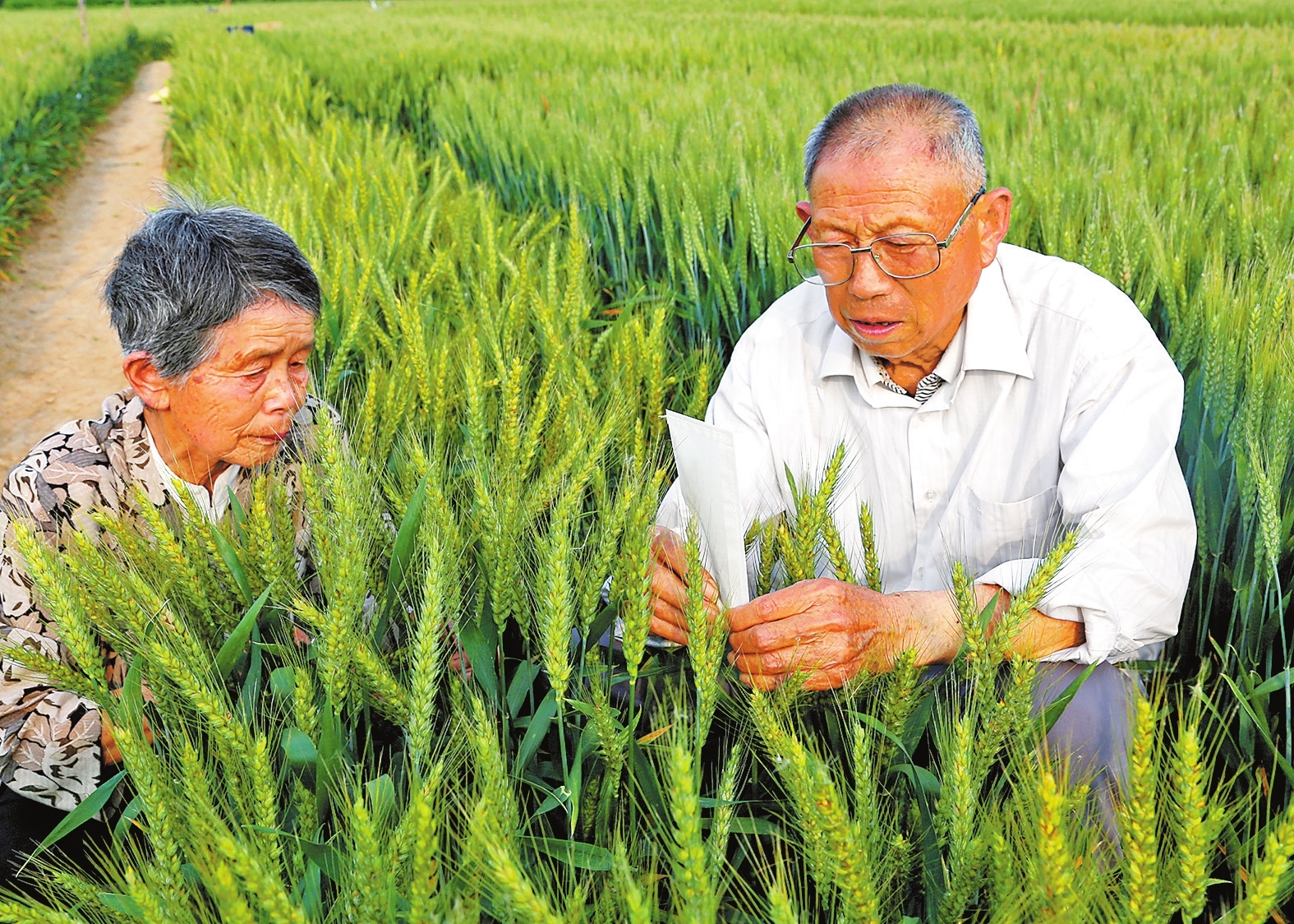 5月15日,鹿邑县前罗楼村试验田里,80岁的高级农艺师罗友邦(右)在观察小麦生长情况。1997年退休后,罗友邦和老伴一起培育小麦新品种,义务向农民传授技术和经验。经过20多年的科学实验,他们培育出的杂交鹿科11号和12号两个小麦新品系,平均亩产1400斤,最高突破1500斤。来源:河南日报 胡洪涛孙广合摄