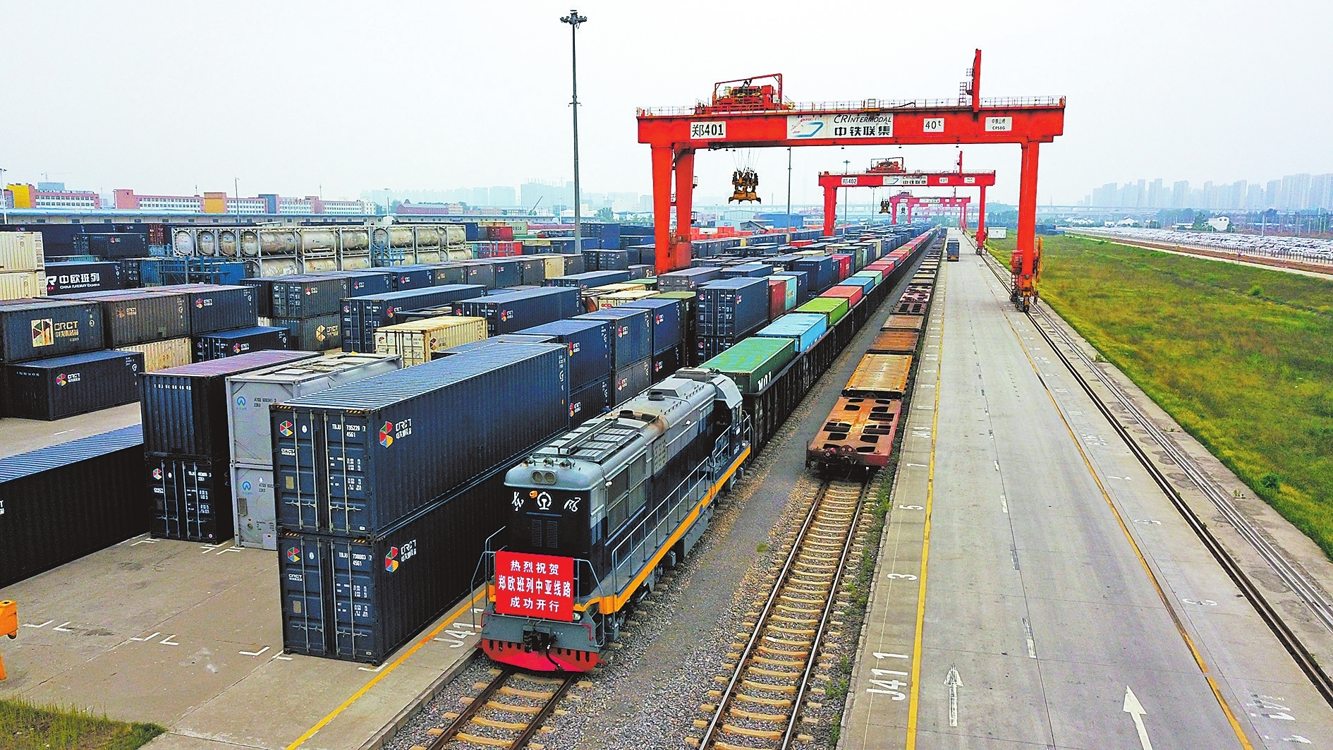 5月18日,由郑州开往中亚的货运班列满载着44节集装箱货物,从郑州铁路集装箱中心站缓缓驶出,开启万里之遥的中亚之旅。河南日报记者聂冬晗摄