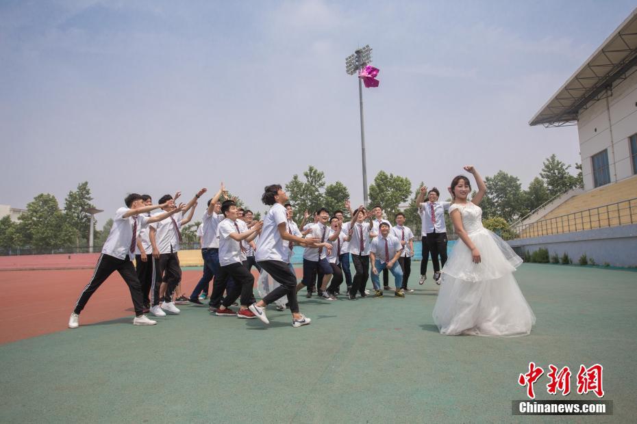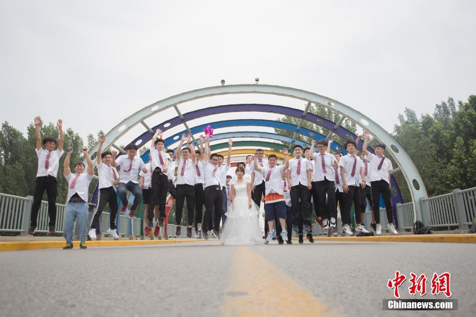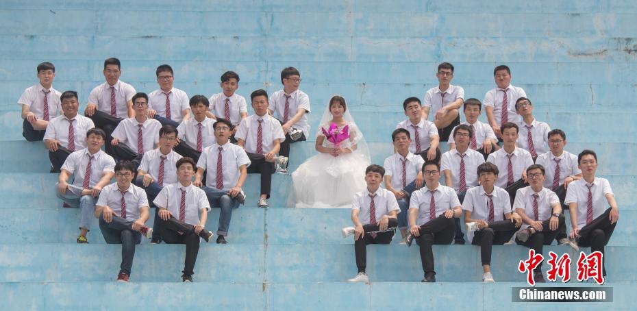 5月26日,山东聊城大学物理科学与信息工程学院电子信息工程 8班共有39名学生,仅有一名女生,该女生叫姚越, 作为班里“国宝级”的人物,姚越享受着“神级”待遇――每逢过节,都有男生偷偷给她送好吃的;平日里打扫卫生,男生们会主动帮助她;就连毕业照,男生都抢着给她“打扮”。近日,该班拍摄了一组毕业照,男生们“众星捧月”,簇拥着班里唯一的一名女生,在学校的各大角落拍摄一张张创意毕业照,留下青春的回忆。 中新社发 许文豪 摄 图片来源:CNSPHOTO