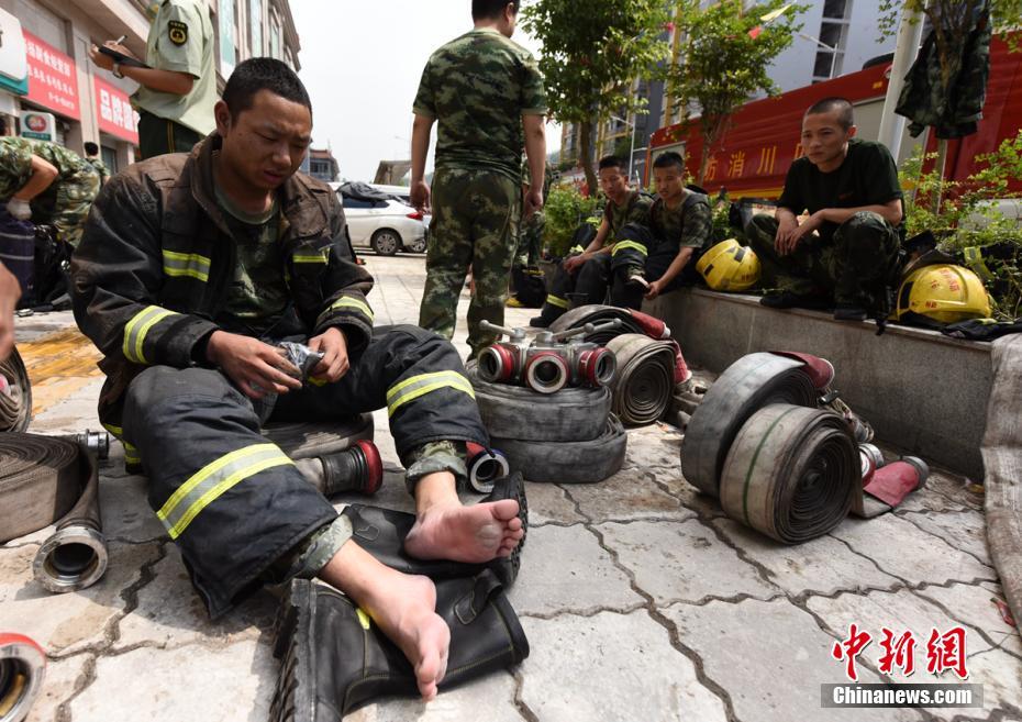 一名参与灭火救援的消防员脚上已起了水泡。四川消防供图