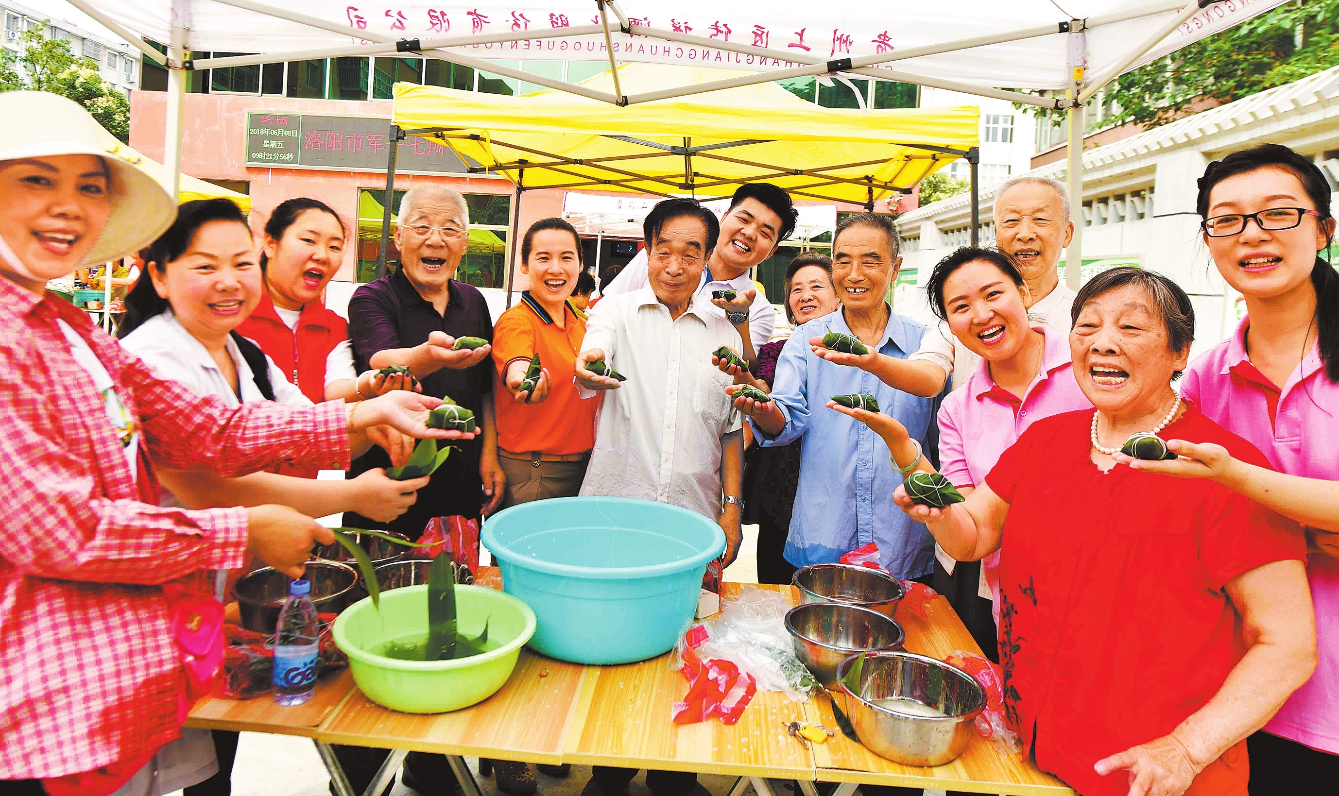 6月8日上午,河南科技大学大学生志愿者来到洛阳军干七所,与这里的一百多位离退休老军人一同包粽子庆端午,向他们送上诚挚的祝福。河南日报 潘炳郁摄