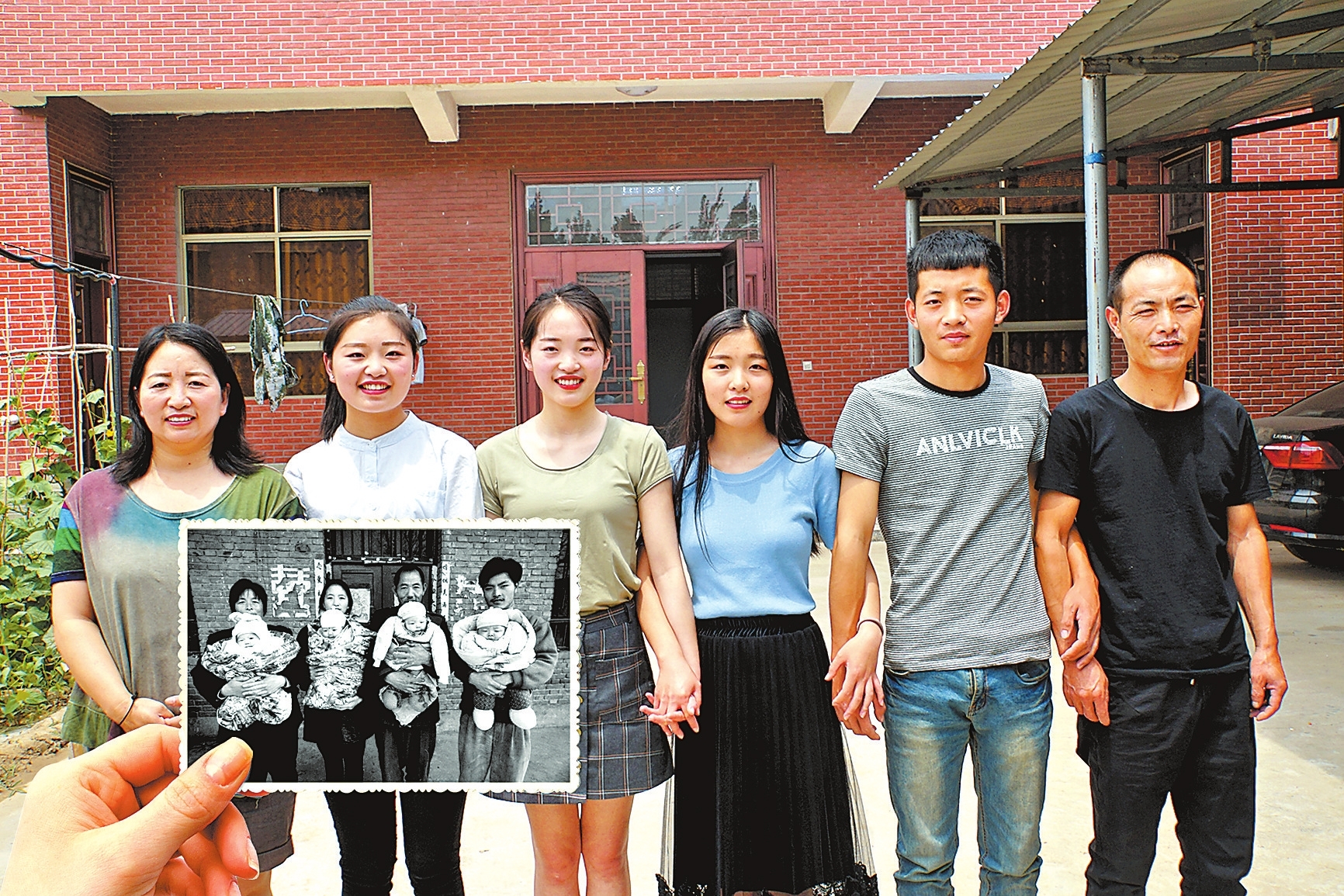 2018年6月,四胞胎的全家福。(小图:1999年10月6日,四胞胎和爷爷奶奶、爸爸妈妈的合影。)