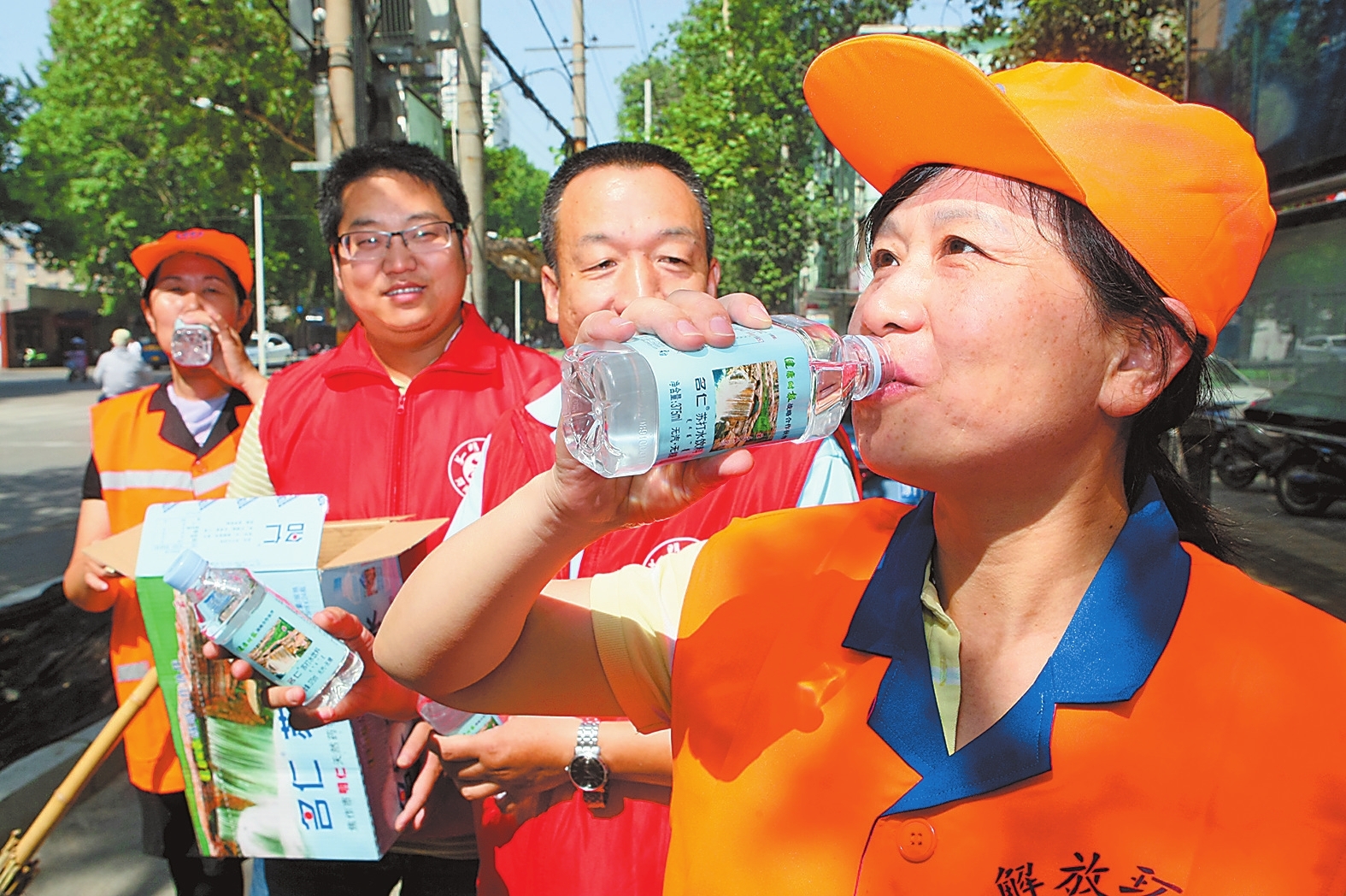 6月11日,焦作市解放区组织志愿者为环卫工人送水。炎炎夏日,焦作市解放区筹资30万元购买矿泉水、西瓜、清凉油、绿豆等物品发送给1000余名环卫工。河南日报 李良贵摄