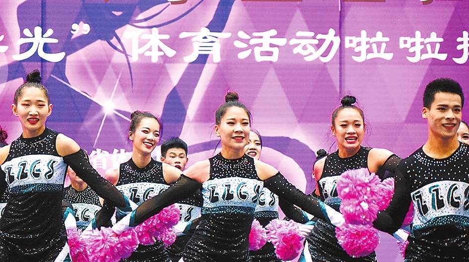 第十三届省运会学生组啦啦操比赛7月9日正式拉开帷幕。啦啦操是集体操、舞蹈、音乐、健身、娱乐于一体的新兴体育项目,在河南的大中小学校园中开展广泛,四年一度的全省体育盛会,吸引了全省69支代表队的1300多名运动员登场角逐。河南日报记者黄晖摄