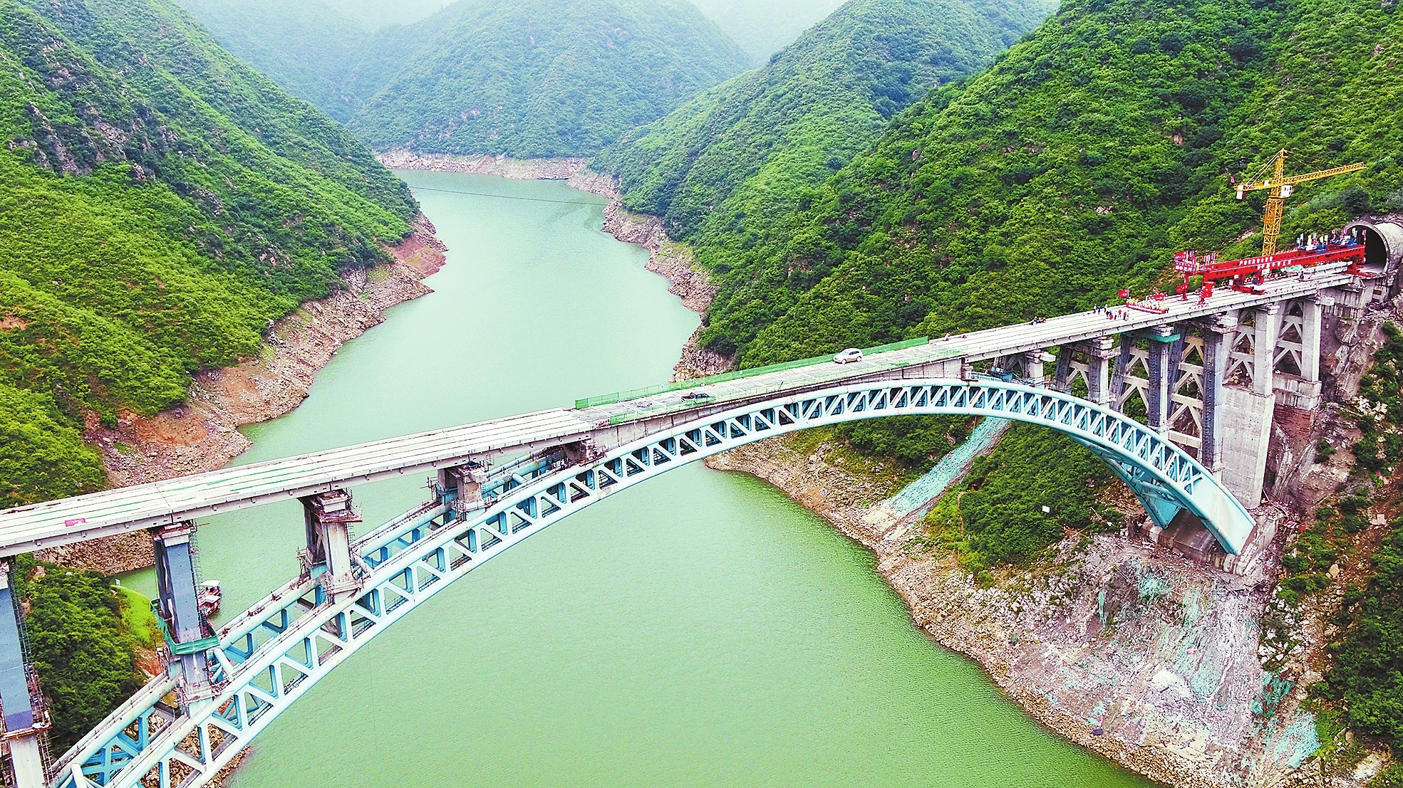 7月11日11时18分,蒙华铁路洛河大桥施工现场,建设者操作架桥机把最后一片16米长、60吨重的T梁安放在桥台上,这标志着蒙华铁路洛河大桥全部T梁架设任务完成。T梁架设的完成也标志着国内首座重载铁路单钢拱桥主体工程完工。来源:河南日报 聂冬晗谢永彬摄
