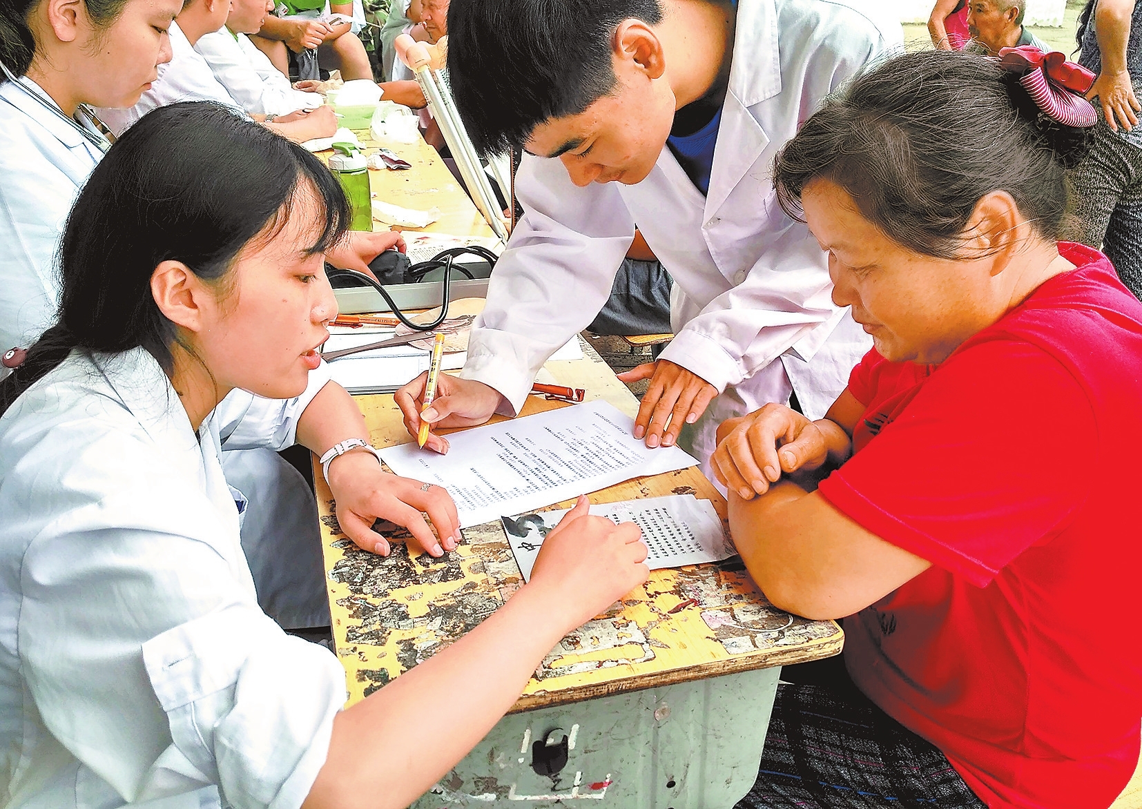 7月11日,河南中医药大学的学生在为群众义诊。暑假期间,该校组织17支“三下乡”社会实践小分队,奔赴固始、内乡、卢氏、新蔡、镇平等地,开展医疗知识普及、健康义诊和基层医师培训等活动。河南日报记者邓放摄