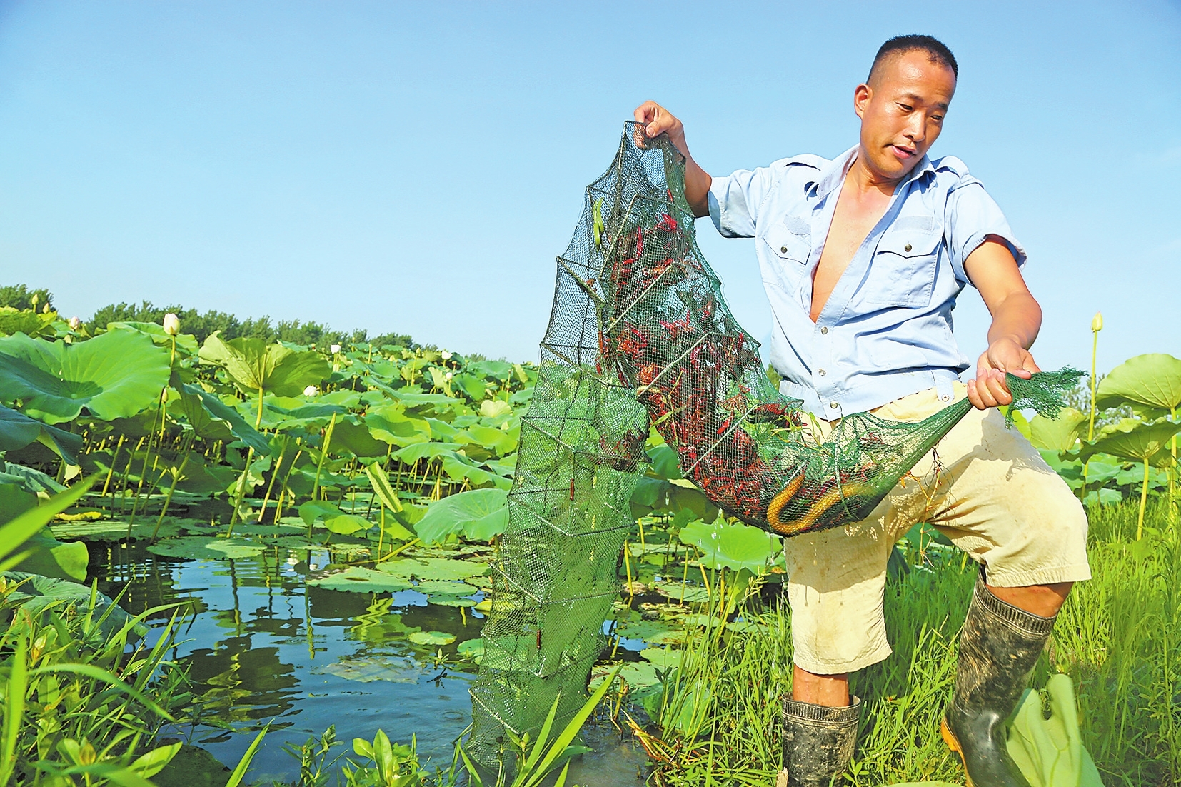 7月12日,淮滨县赵集镇马营村莲虾立体养殖基地,养殖户正在莲塘里收获小龙虾。近年来,该县大力推广莲虾、稻鱼混养,帮助农民增加收入。来源:河南日报 吴锋摄