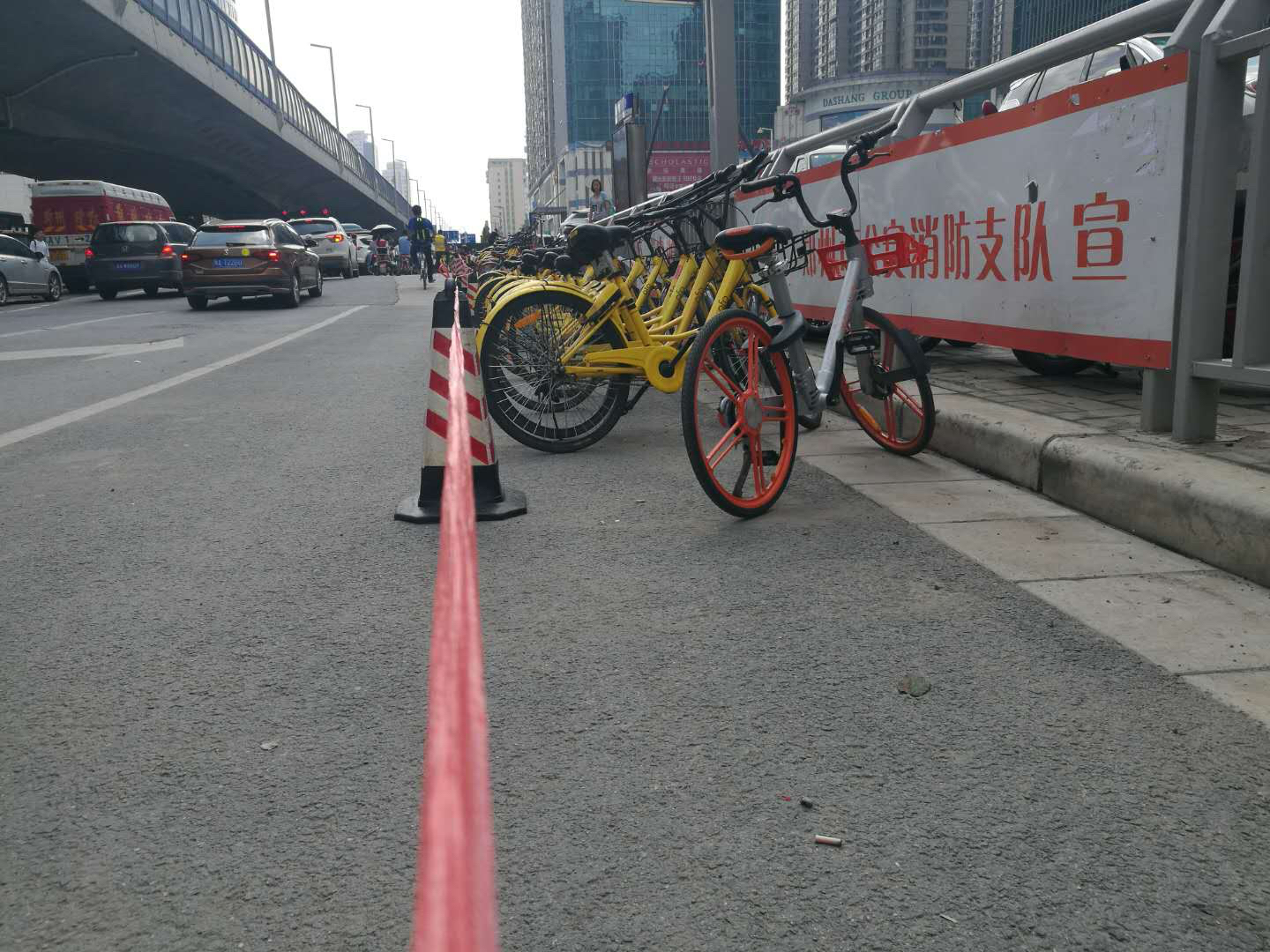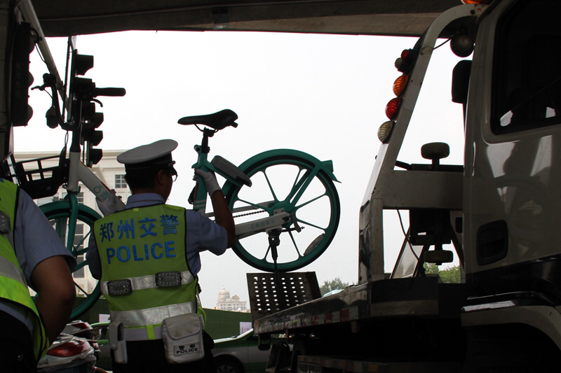 7月17日上午,记者来到陇海路与桐柏路交叉口时,发现交警正在清理几辆停在路边的电动自行车。几名共享单车公司的工作人员,正将市民骑完停在路上的单车,整齐地摆放到路边人行道旁。很快,路口道路变得整洁畅通。