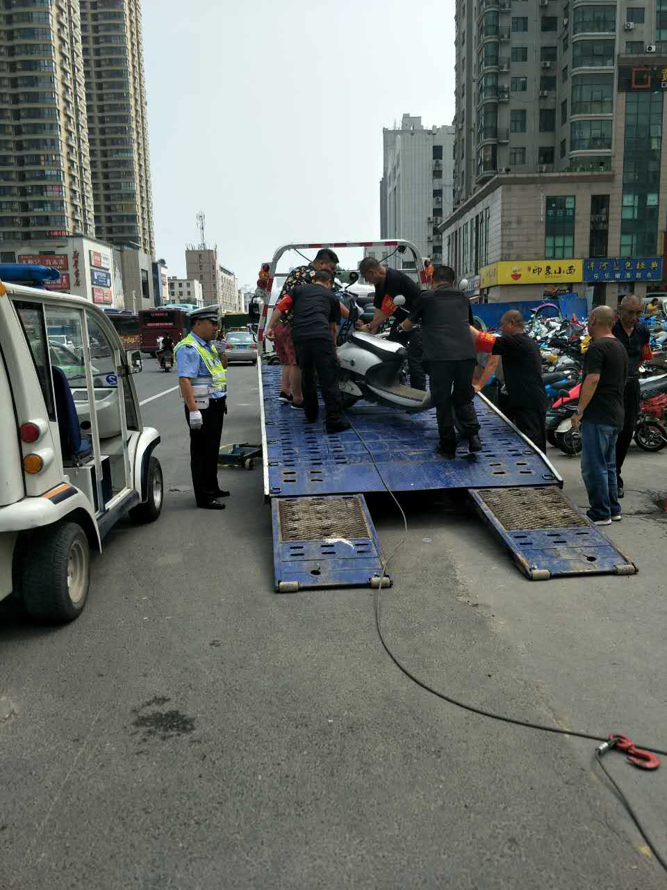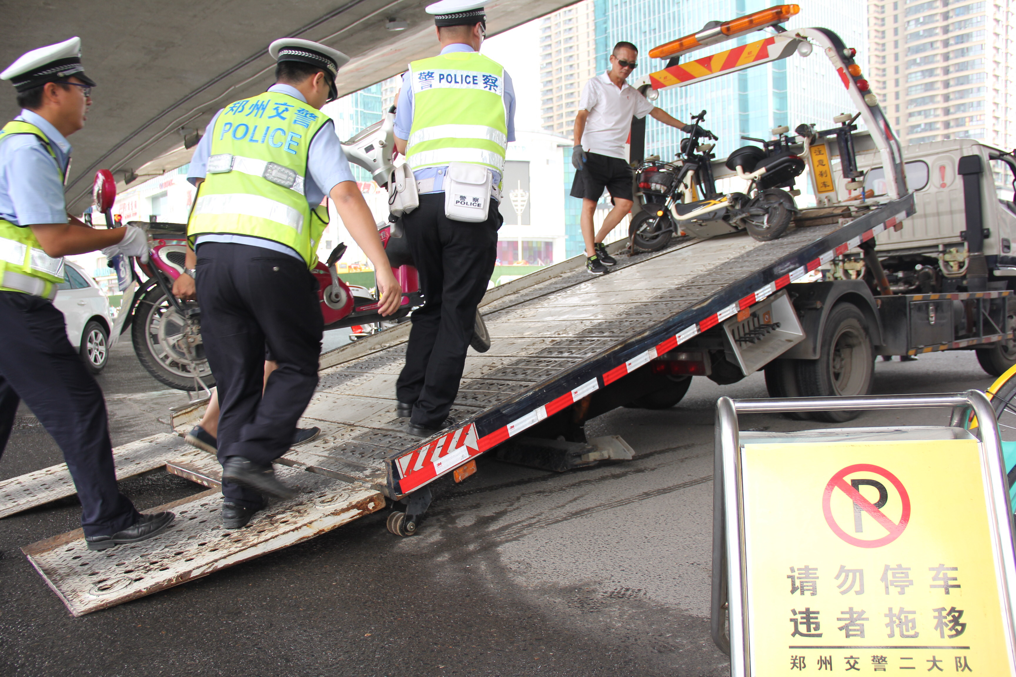 10天前,由三个办事处出面,向沿街的商场和写字楼物业部门、培训机构的管理人员,下发了《关于进一步加强机(电)动三轮车、机(电)动四轮车管理的通告》,让他们管理好自己业主和师生的各种车辆,不要在街上乱停乱放。与此同时,交警联合办事处、执法局和地铁公司,每天安排人员在路口对乱停乱放的机动车和非机动车进行劝阻、劝离,对不听劝阻的违停车辆,由交警使用拖车拖移。近10天里,交警先后在该路口共拖移了各种违停车辆1000多辆。