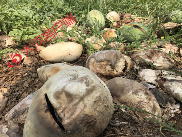 记者发现,以前被砍的西瓜在事发后不久,就被王彦明从瓜殃上摘下来,分成堆儿放在地里。如今,这一堆堆的被砍西瓜,已经腐烂得只剩下一层干皮,让人很难与那些翠皮红瓤的新鲜西瓜联系在一起。