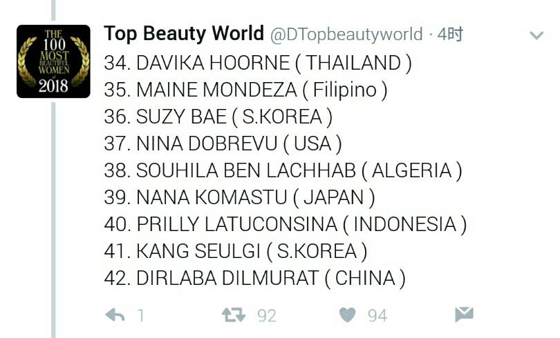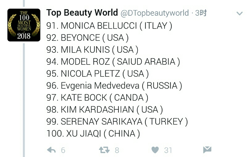 近日,由美国某网站评选的全球最美100位女性出炉,中国大陆地区的迪丽热巴和SNH48成员许佳琪被提名世界最美女性,两人分列第42和第100名。
