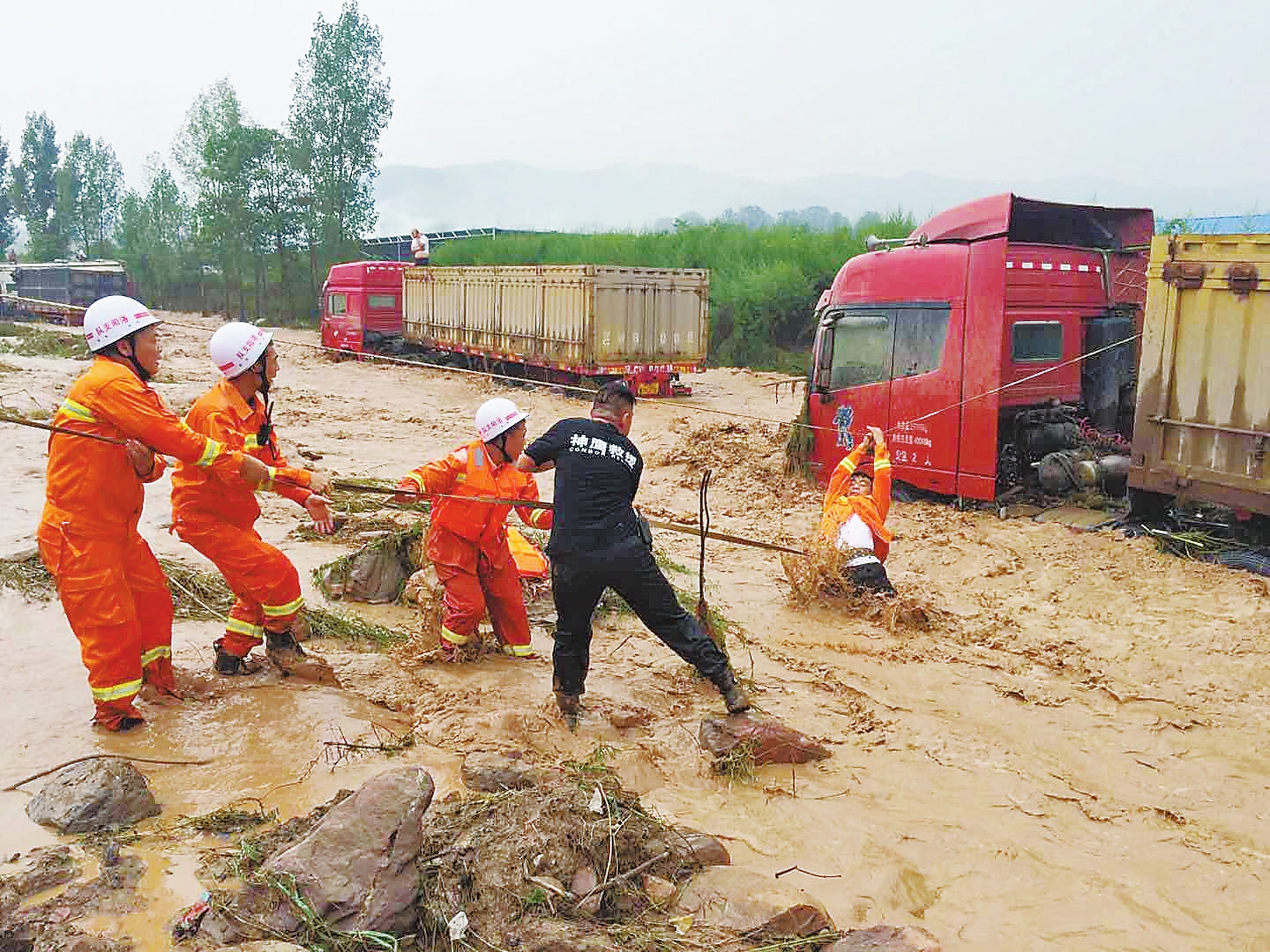 8月5日上午,偃师市府店镇境内突降暴雨,引发山洪,50余辆重型卡车在干涸河道内受到波及,有人员被困。事发后,消防大队、洛阳神鹰救援队等多支救援力量携带装备赶赴现场救援。