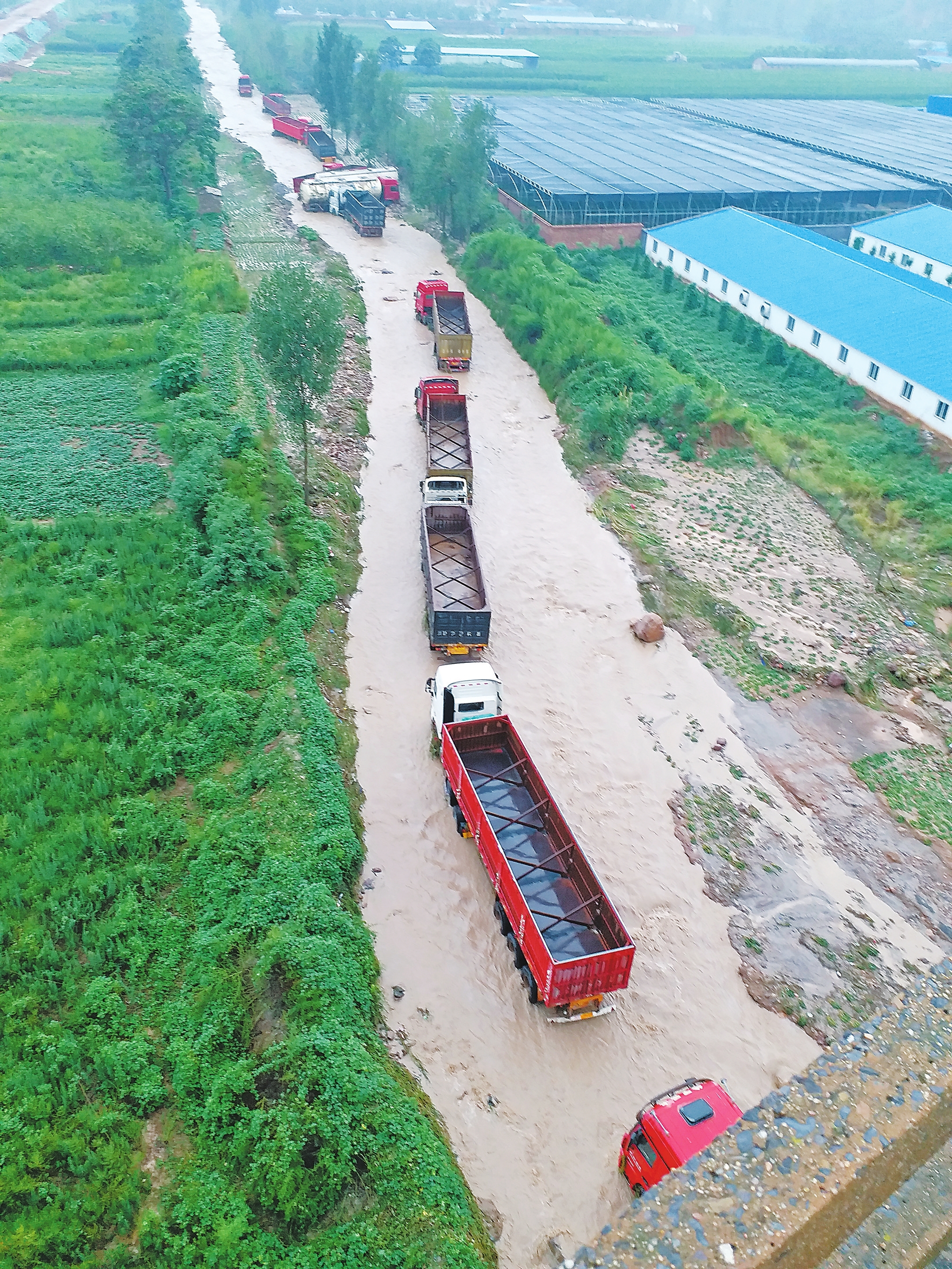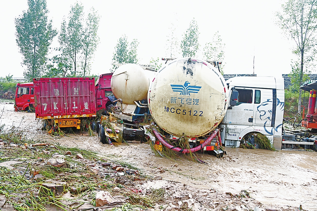 据司机们介绍,他们平时靠拉青石子为生,每辆卡车价值30万至60万不等,“都是贷款买的,一个月得还两万多,这回被水一淹,算完了”。多名司机看着自己被大水冲坏的卡车,迟迟不愿离开现场。