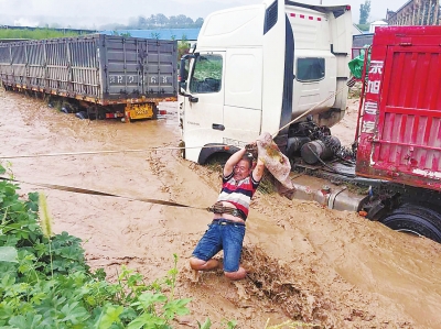 据司机们介绍,他们平时靠拉青石子为生,每辆卡车价值30万至60万不等,“都是贷款买的,一个月得还两万多,这回被水一淹,算完了”。多名司机看着自己被大水冲坏的卡车,迟迟不愿离开现场。