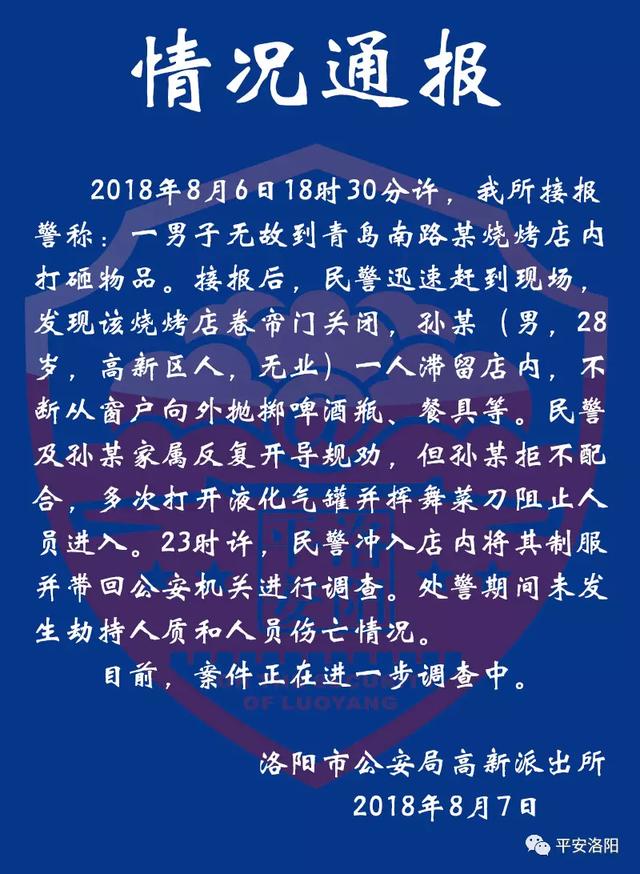 下午1时许,“平安洛阳”发布情况通报:2018年8月6日18时30分许,我所接报警称:一男子无故到青岛南路某烧烤店内打砸物品。接报后,民警迅速赶到现场,发现该烧烤店卷帘门关闭,孙某( 男,28岁,高新区人,无业)一人滞留店内,不断从窗户向外抛掷啤酒瓶、餐具等。民警及孙某家属反复开导规劝,但孙某拒不配合,多次打开液化气罐并挥舞菜刀阻止人员进入。23时许,民警冲入店内将其制服并带回公安机关进行调查。处警期间未发生劫持人质和人员伤亡情况。目前,案件正在进一步调查中。洛阳市公安局高新派出所2018年8月7日。