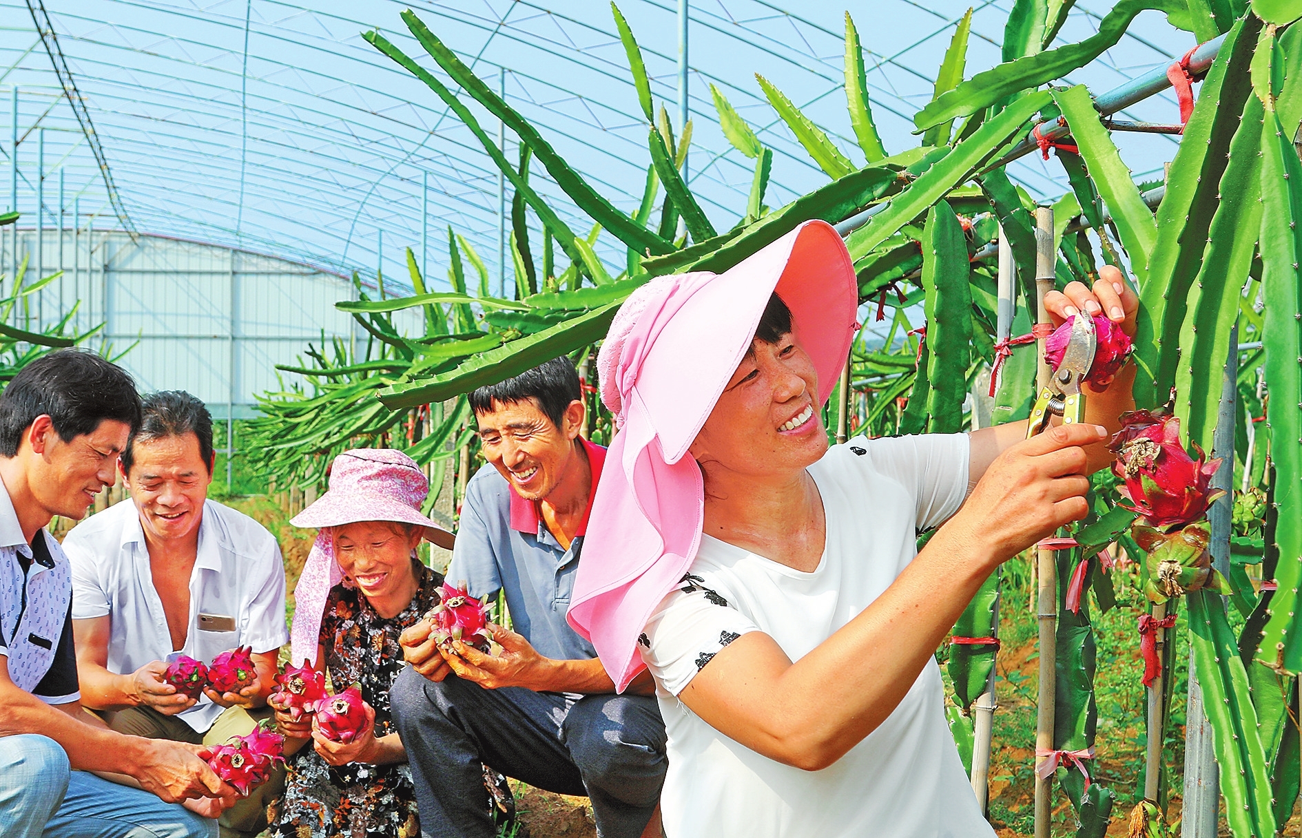立秋时节,我省各地种植的不少农作物喜获丰收。图为8月7日,光山县孙铁铺镇周乡村盛泰达专业合作社社员在采摘火龙果。该社种植的红心火龙果今年亩均产值可达2.6万元,带动当地贫困户增收致富。河南日报 谢万柏摄