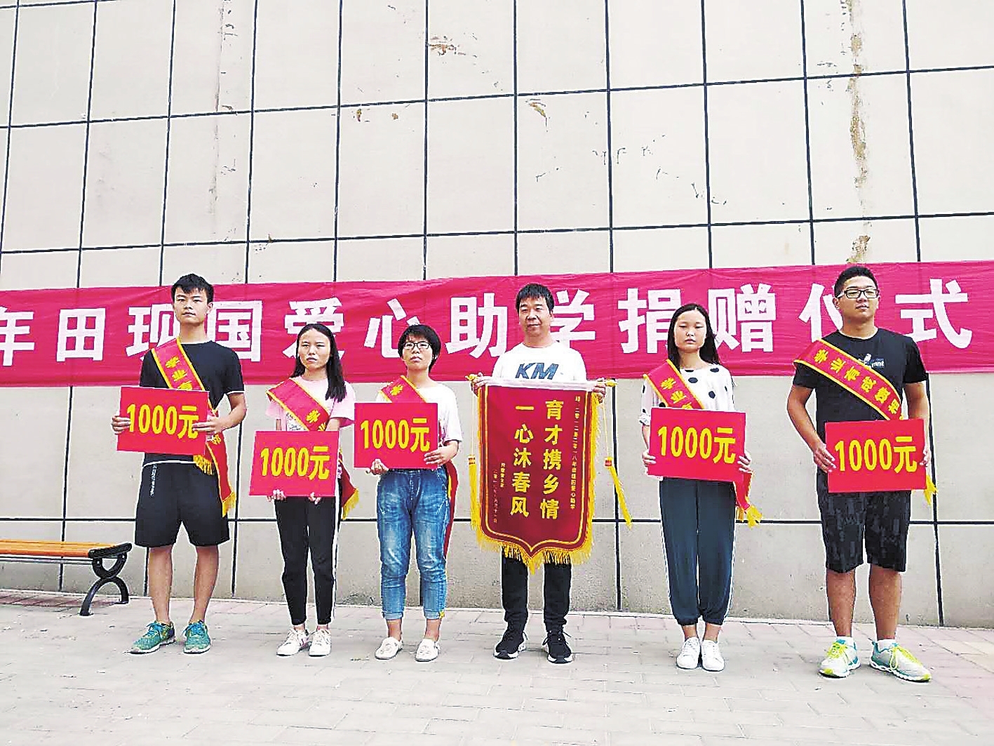 9月2日,袁付村村委会专门在村委大院内举办了一个爱心助学捐赠仪式。13名准大学生或不能到场学生的家长分批领到了每人1000元资助金。而这些钱全是该村党支部副书记田现国自费捐赠的。“小时候,街坊邻居对俺都很好。如今俺生活条件好了,挣了点钱,也看不得街坊邻居们受苦,咱能帮一把是一把。”捐赠仪式结束,51岁的田现国受访时说,以前袁付村在洛阳伊滨区是个比较落后的村子,村里大学生不多,但父亲常在他耳朵边念叨,知识才能改变命运,为了改变村子落后面貌,他便想资助大学生。于是,从2012年起,他开始为村里在本年度考上本科的大学生,每人资助1000元。至今,他已累计资助60多名大学生,金额达6万多元。