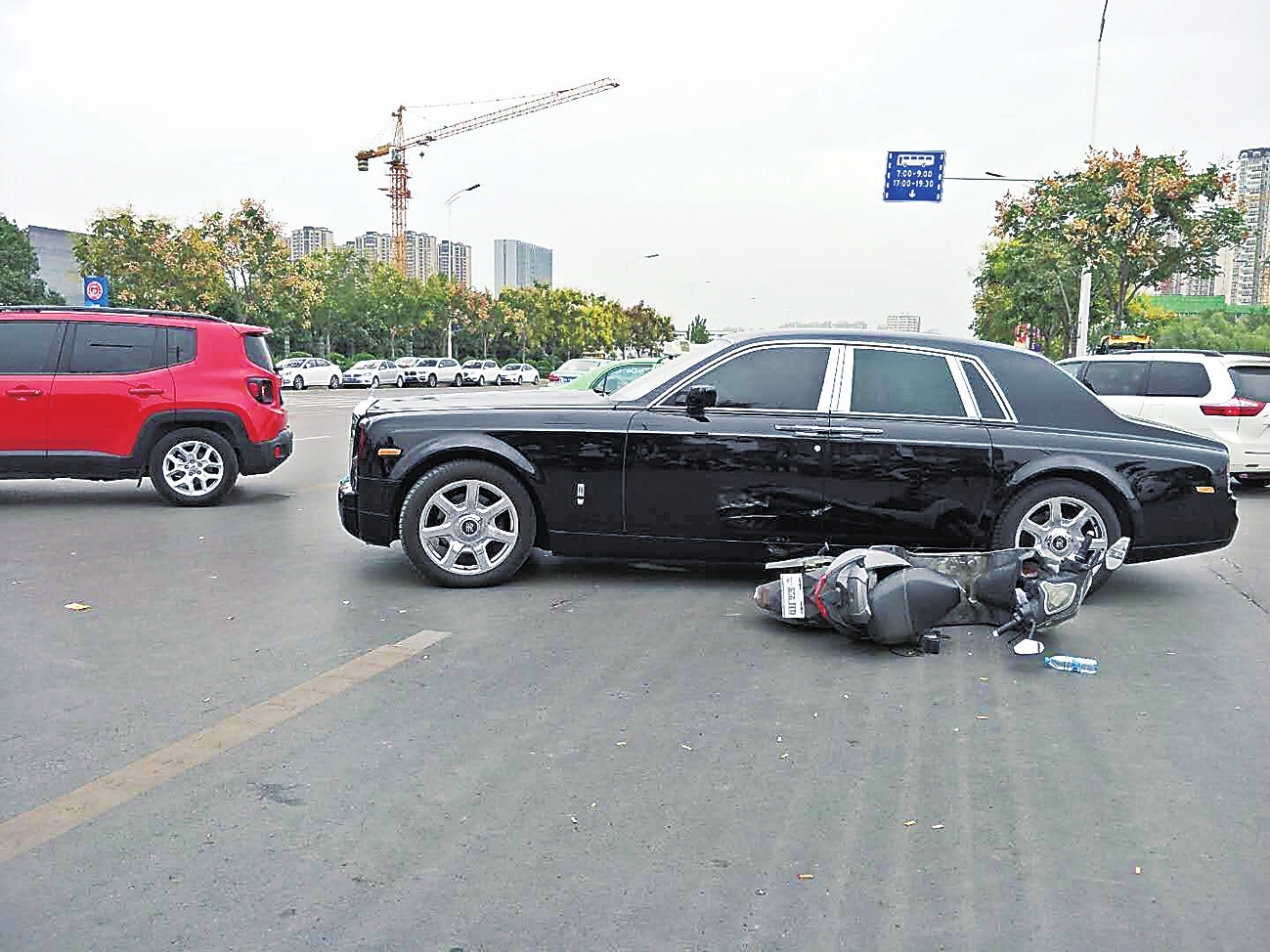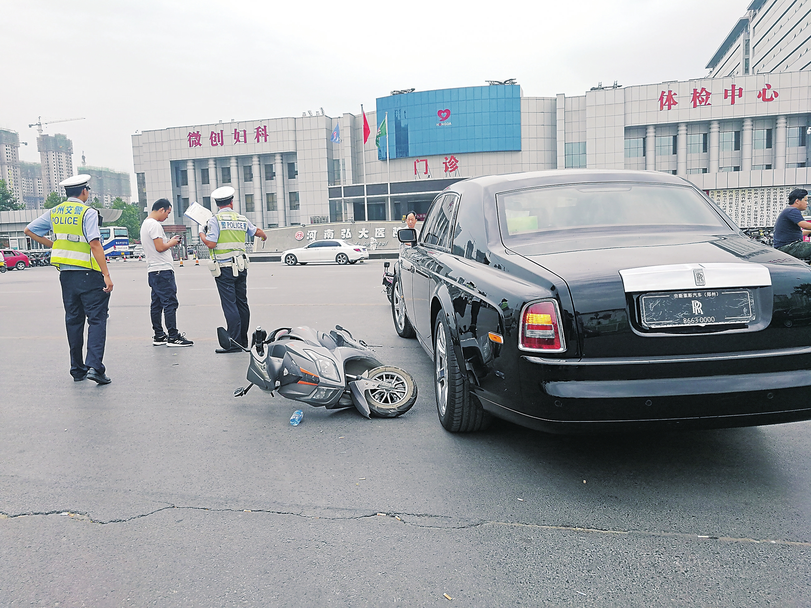 9月5日上午10点钟左右,郑州市桐柏南路与滨湖南路丁字路口,一辆豫A牌照劳斯莱斯幻影豪车从东面的帝湖花园小区方向驶来时与一辆电动车相撞,轿车车体受损不大,但修复价格不菲。电动车主惊厥抽搐,送医治疗。当着处警民警的面,有人遮挡住涉事车号牌,并将其驾驶挪移至50米远处的医院院内。