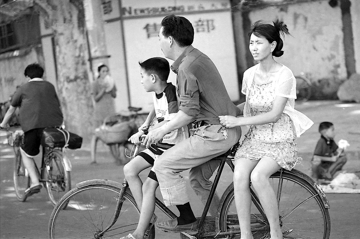 1992年夏,郑州一家三口骑自行车出行。