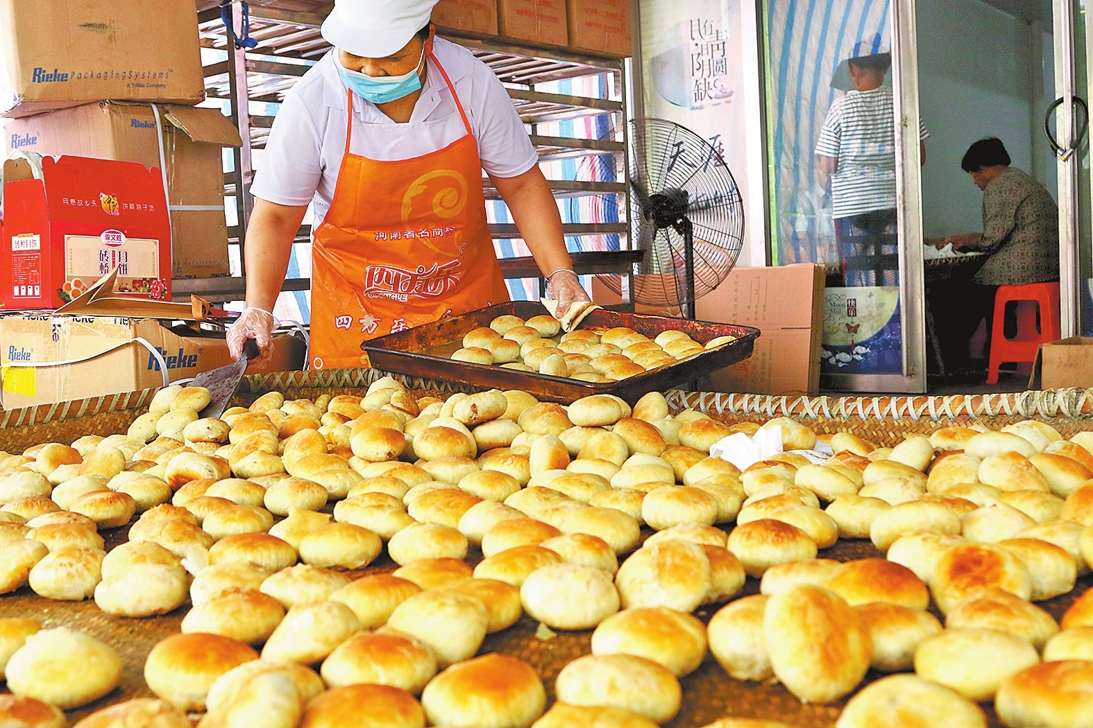 9月17日,光山县砖桥镇李文胜月饼加工厂工人在加工酥皮月饼。中秋节临近,该厂通过网络将月饼销往全国各地,让更多的人吃上传统的砖桥月饼。谢万柏摄