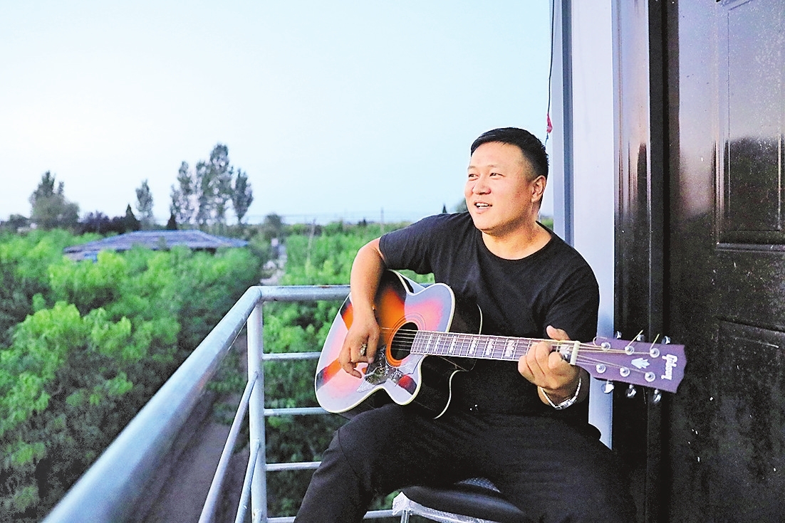 9月21日,侯利强在自家果园的小楼上弹吉他。