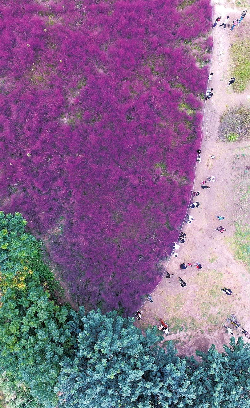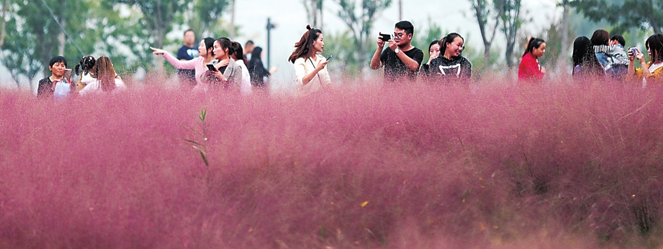 大量游人在“粉黛乱子草”前游玩儿、拍照