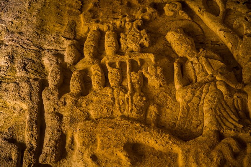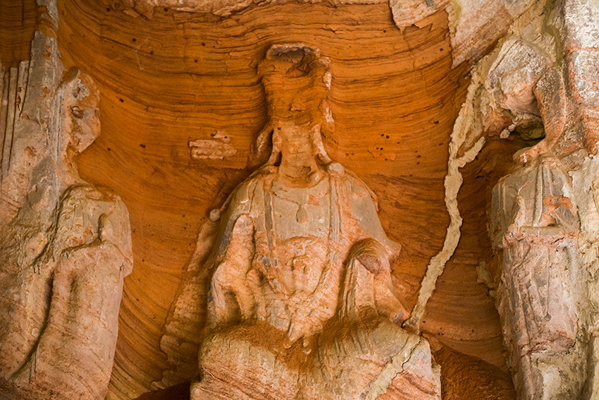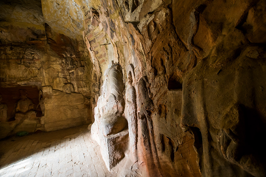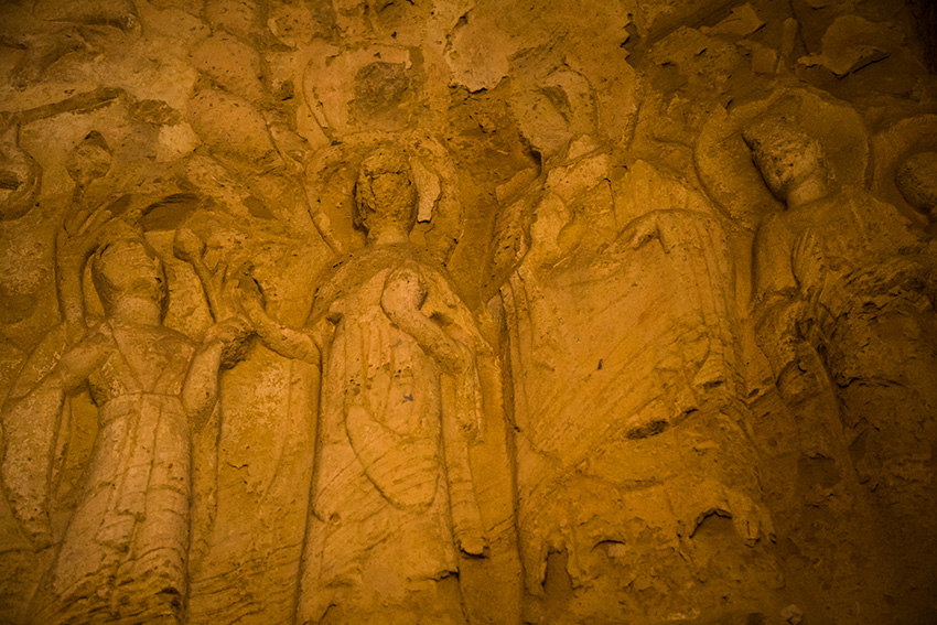 据史料记载,鸿庆寺开凿于北魏晚期的386年至534年,距今已有1500多年历史。鸿庆寺原名叫三圣庙,公元698年,女皇武则天带着孙女安乐公主巡幸该寺时,忽然有上万只大雁飞翔寺院上空,云集白鹿山上,便欣然赐名“鸿庆寺”。(石窟里被岁月风蚀的石佛像)
