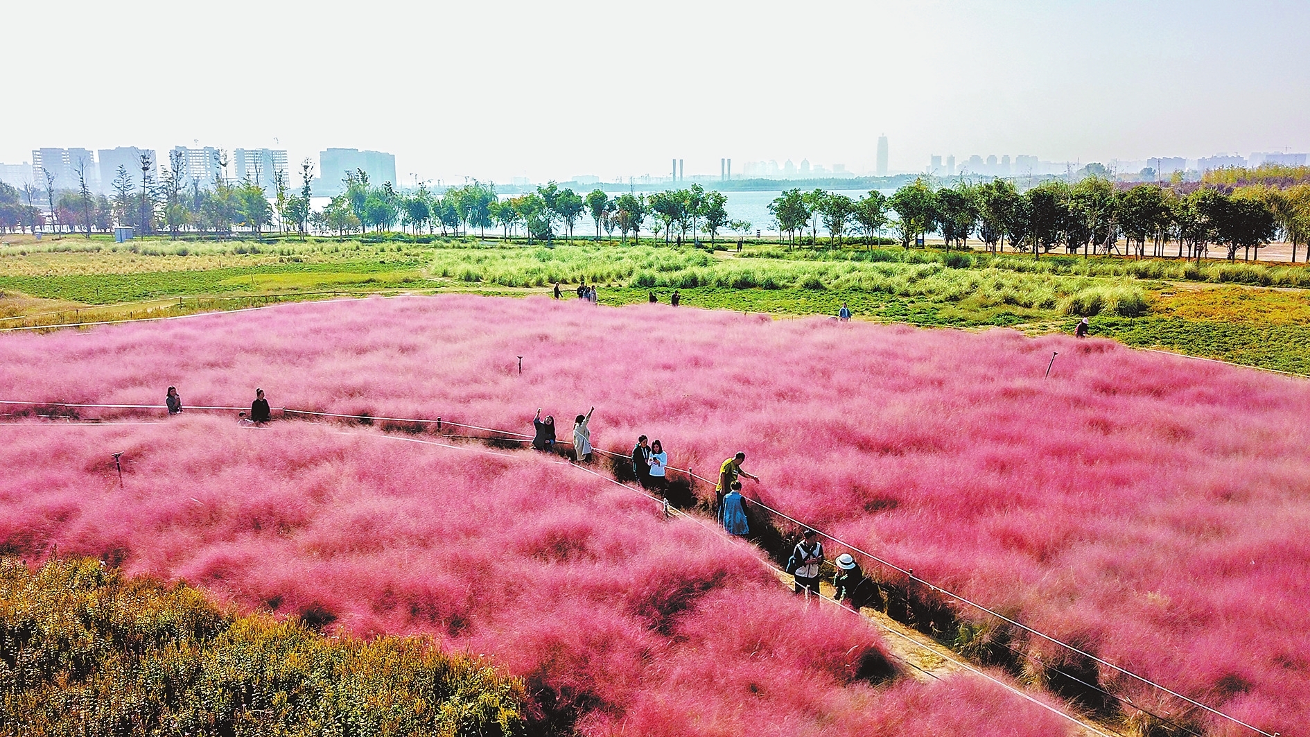 上图为10月10日,郑州北龙湖湿地公园,市民在粉黛乱子草的“海洋”中漫步。粉黛乱子草属多年生、暖季型草本植物,花期在9月中旬至11月中旬,开花时如梦如幻,让观者流连忘返。河南日报记者聂冬晗摄