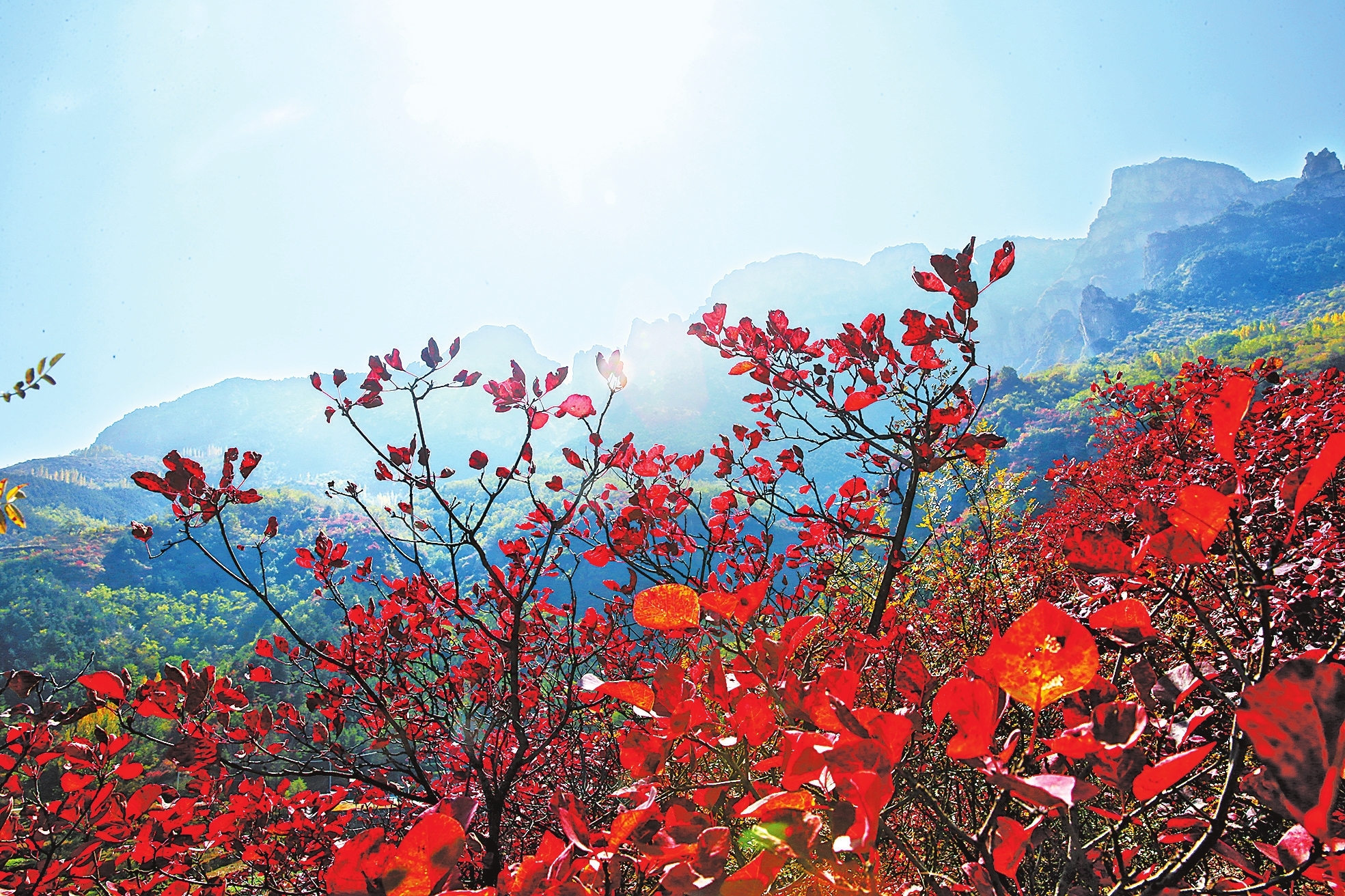 寒露时节,太行山脉红叶簇簇,美不胜收。图为10月10日,林州市石板岩镇车佛沟村的红叶美景吸引了大批游客前来,尽享中原大地的秋日韵味。河南日报记者王铮摄