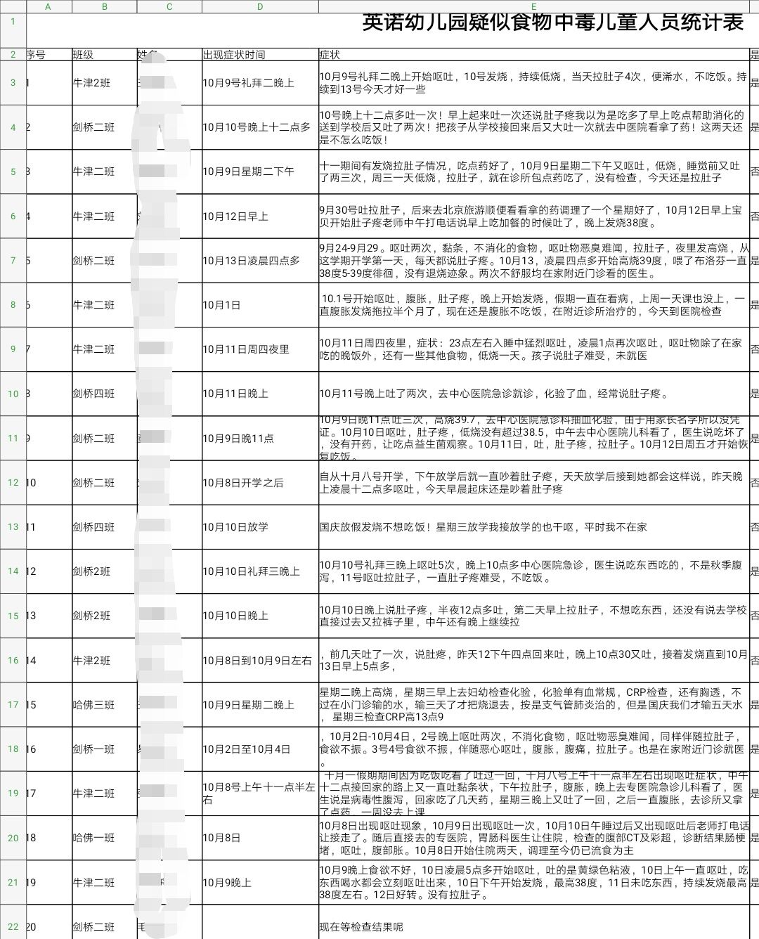 这些家长向记者提供了一份他们自发统计的疑似食物中毒学生名单,记者看到,“食物中毒”情况始发于10月1日,此后的10月8日、9日、10日、12日、13日等,均有学生相继出现“疑似食物中毒”情况。