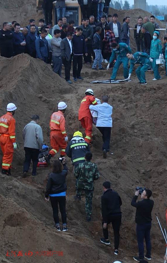 10月18日下午5时,记者在现场看到。此时,现场周围已被挖出了一个近200平方米大坑,周围停放有三台铲车和四台挖掘机。在被挖开的大坑内,有二三十位消防战士和救援人员仍在使用铁锨等工具进行挖掘救援;井旁,几名消防战士在不停地往井内送入输氧等救援设施。据现场救援人员介绍,由于现场土质松软,为了防止发生塌方,所以不适合再用机械挖掘。目前,他们挖掘有十多米深,救援工作仍在努力进行中。