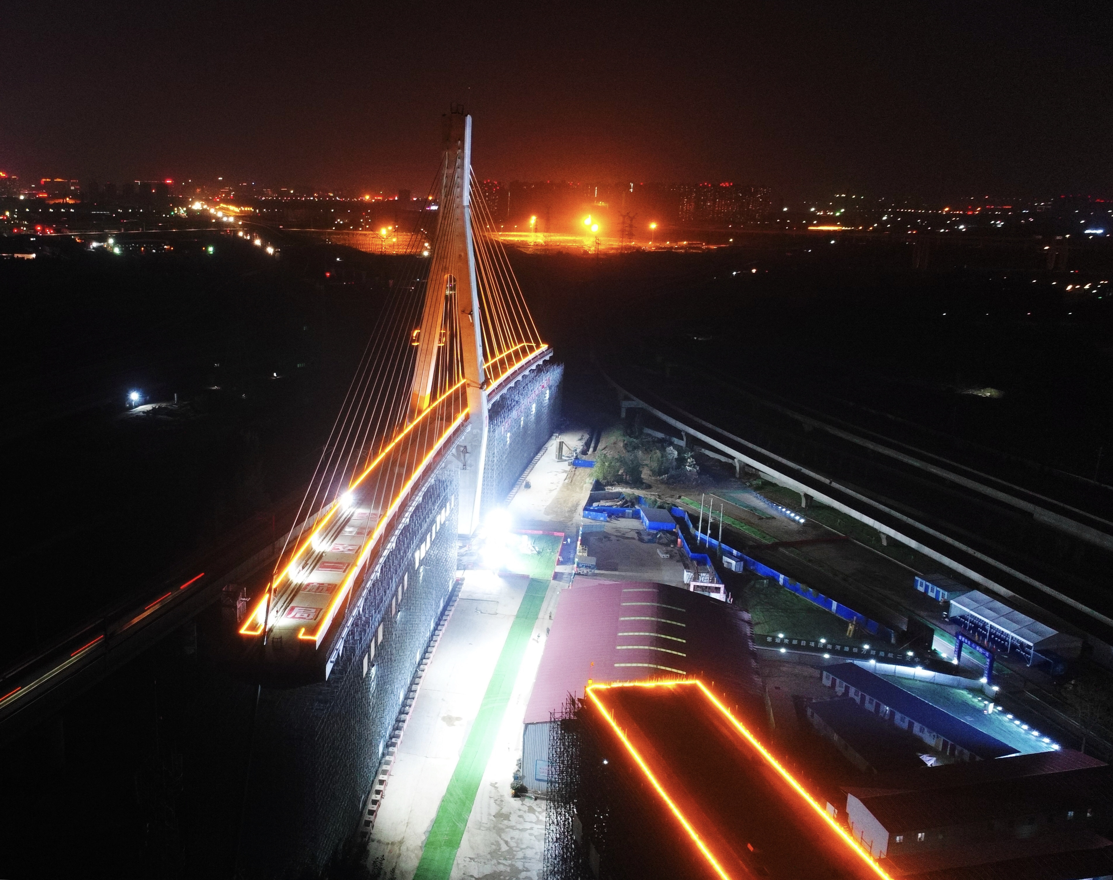 10月24日凌晨零时55分,随着现场主控员按下启动按钮,2台千斤顶同步牵引钢绞线,带动转盘匀速转动,由中交二航局承建的国内铁路最大纵坡最大偏心曲线转体斜拉桥,开始在郑州经济开发区曹古寺村30米的高空中进行转体。