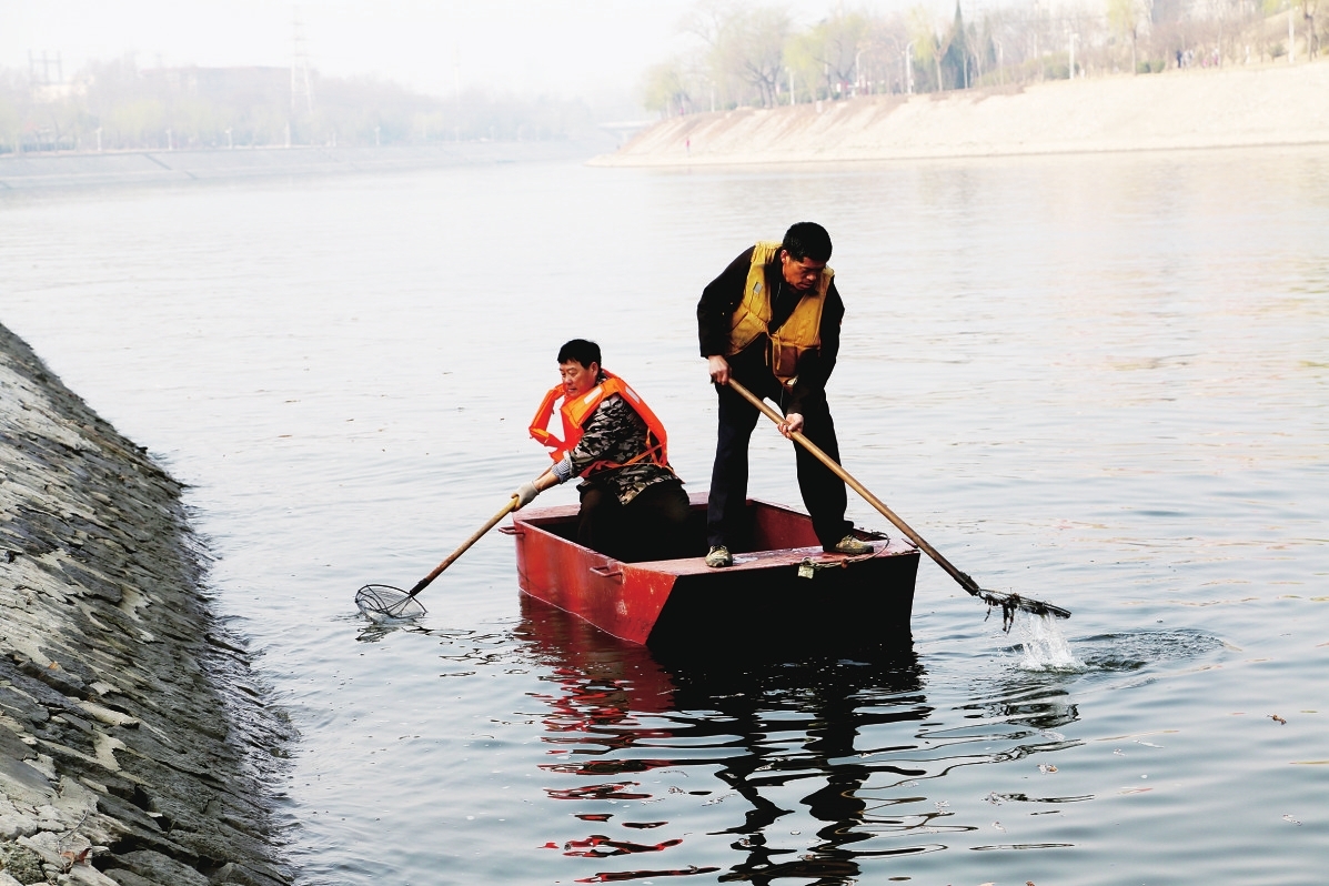 管护工人在打捞安阳河内漂浮物孟红军摄