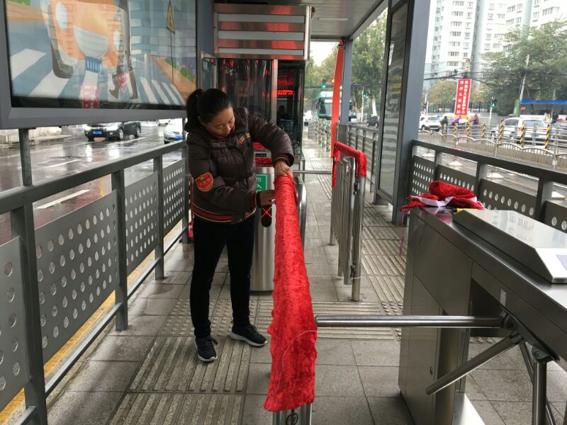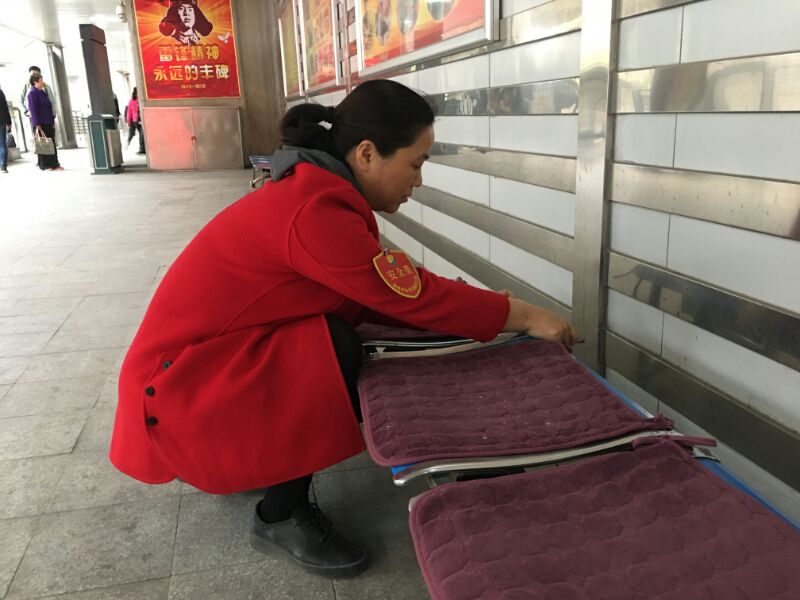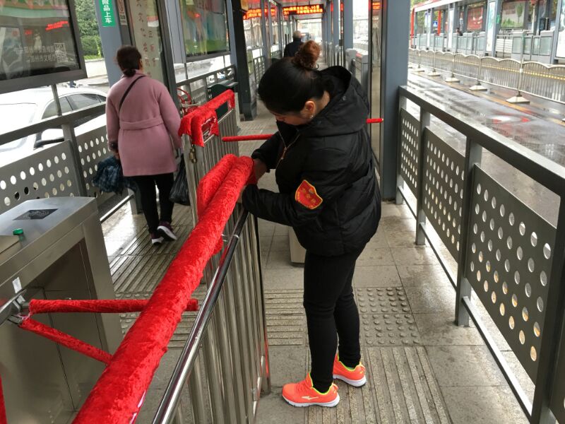 秦岭路线路长吴静介绍:"为让乘客等车过程中多一点温暖,他们为站台坐椅装上了暖和的纯棉坐垫,每个坐垫都镶有一层海绵里子。很人性化,座垫软软的质地,坐上很舒适,告别了以往冷冰冰的钢铁座椅。另外站台里不仅有坐垫,还专门为进出站台口的护栏和残疾人通道门加装了棉套,老年乘客或是腿脚不太灵活的乘客在进出站时都习惯性的扶着站台的围栏。天气太冷了,给它们穿上棉衣,这样乘客就不冷了。"