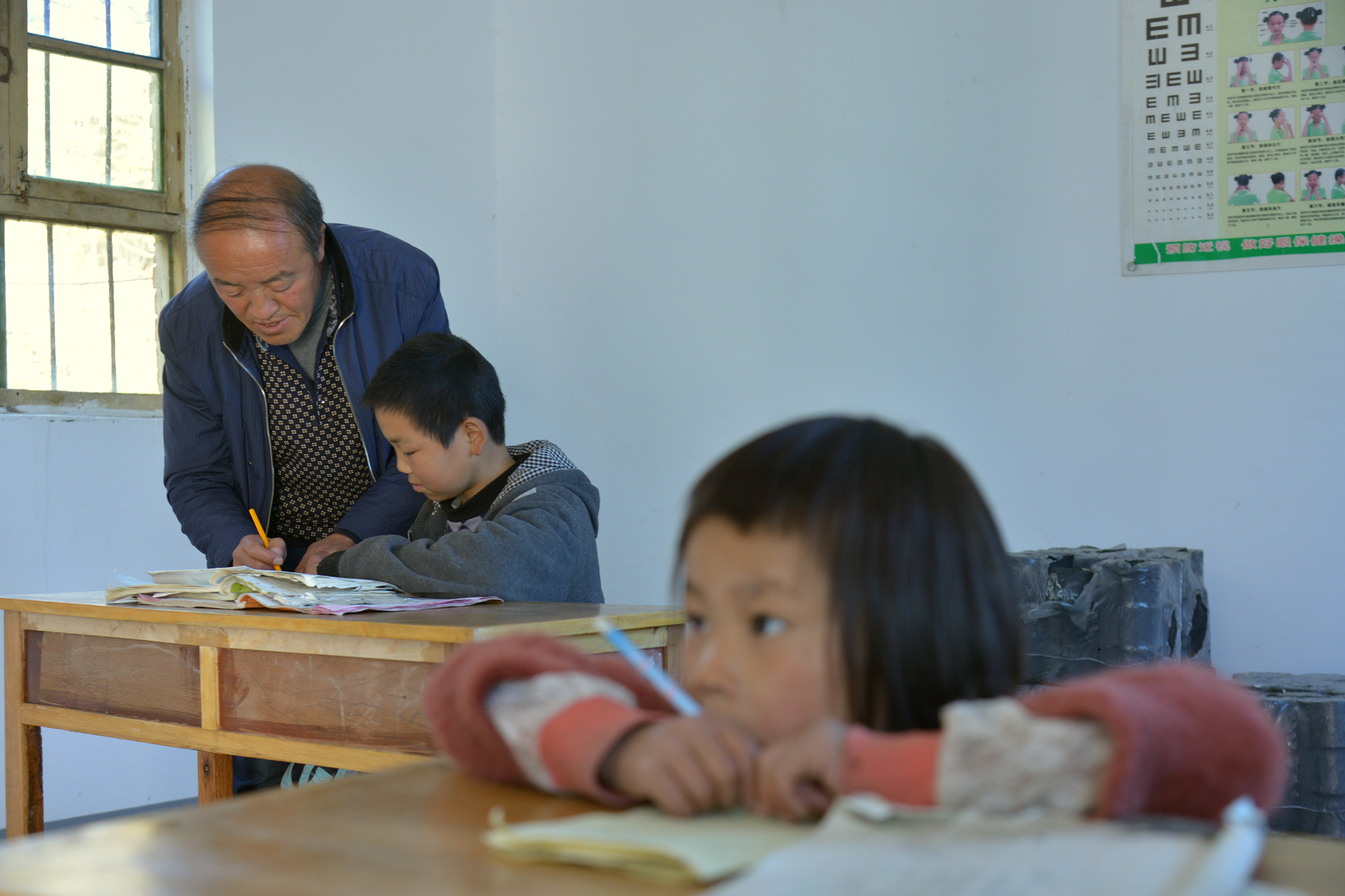 孔文卿老师正在给花山小学仅有的两名学生上课