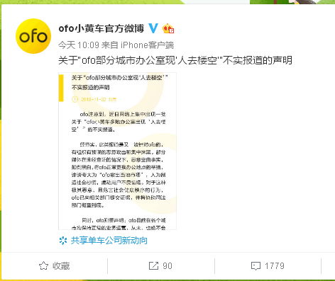 11月22日上午10时9分,ofo小黄车官方微博对此发出声明,该声明中表示,ofo注意到,近日网络上集中出现一批关于“ofo小黄车多地办公室出现人去楼空'”的不实报道。经查实,此类报道是又一波针对ofo的,有组织有预谋的恶意攻击和集中抹黑。部分媒体在未经查证的情况下,恶意歪曲事实,颠倒黑白,将ofo正常更换办公地点的举措,诽谤夸大为“ofo撤出当地市场”,人为制造社会恐慌,煽动用户不良情绪。对于这种极其恶意,且危害社会健康秩序的行为,ofo已向相关部门提交证据,并将协助司法部门彻查到底。同时,ofo郑重声明:ofo目前在各个城市均保持正常的业务运营,从未、也绝不会放弃地方城市市场,请广大用户放心使用。