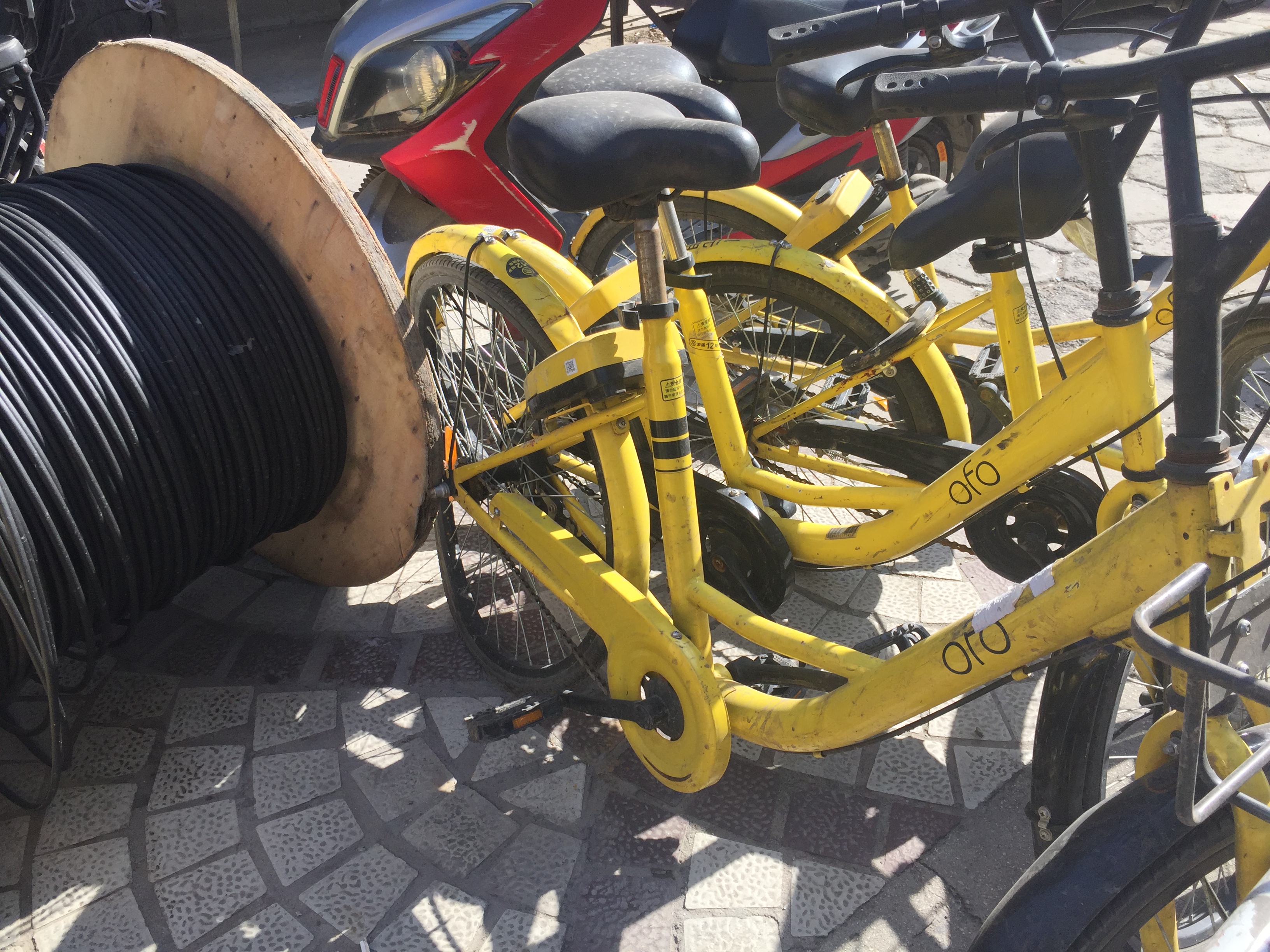 花园路农业路交叉口东南角人行道边上的一排小黄车,车座被人掰歪
