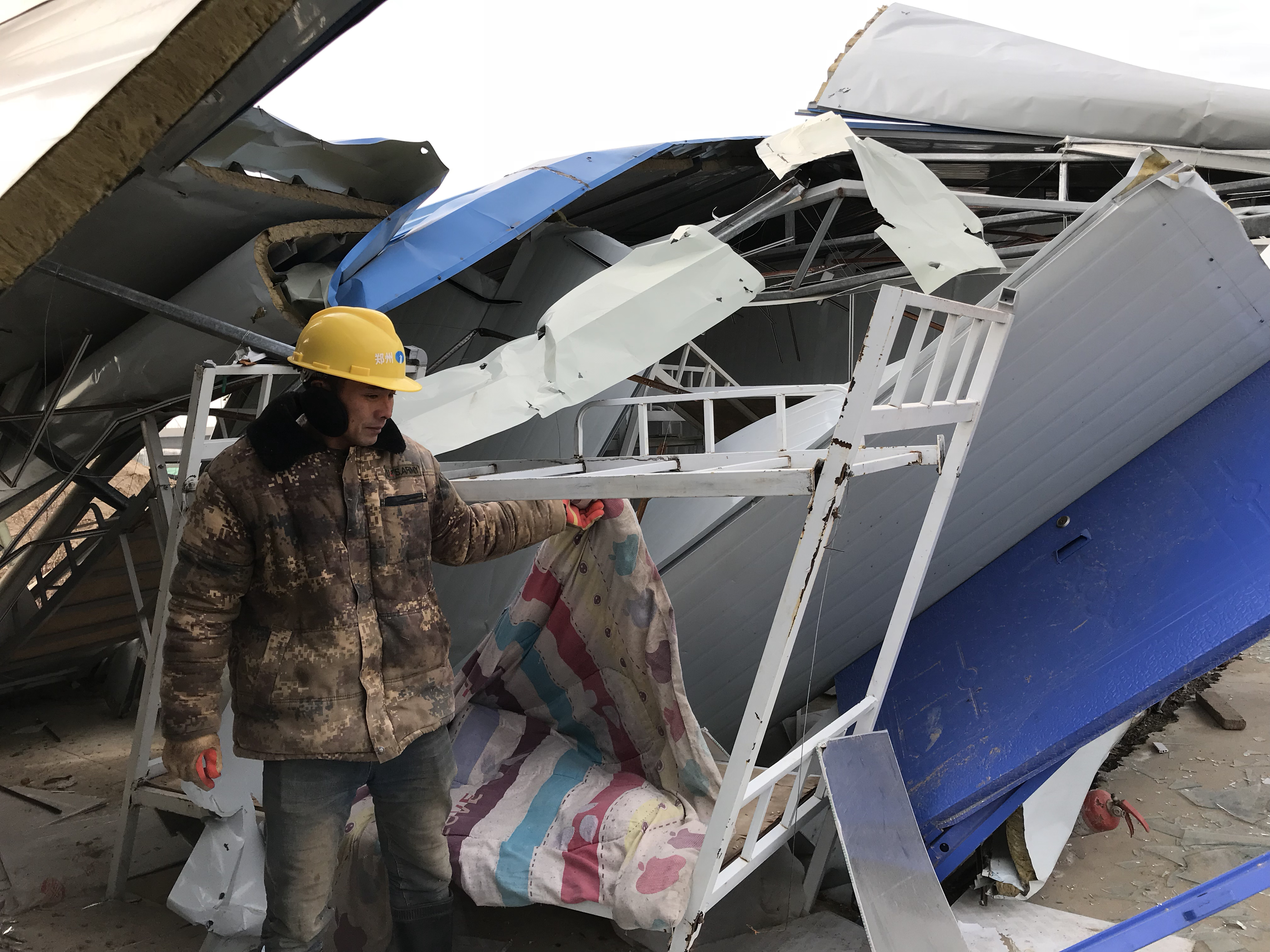 今天上午10时30分,记者在陇海路与西三环交叉口西约1公里的渠南路下穿陇海路二号隧道施工工地南侧,见到了这些被拆得七零八落的工人宿舍。宿舍由彩钢板建造,共有10间,西侧两间是职工食堂和厨房,剩余的是工人休息的宿舍,里面均摆放着上下铺床。此时,十几名工人正站在被毁的宿舍前,有的在搜集被埋压在废虚里的私人物品,有的则裹着被子取暖。