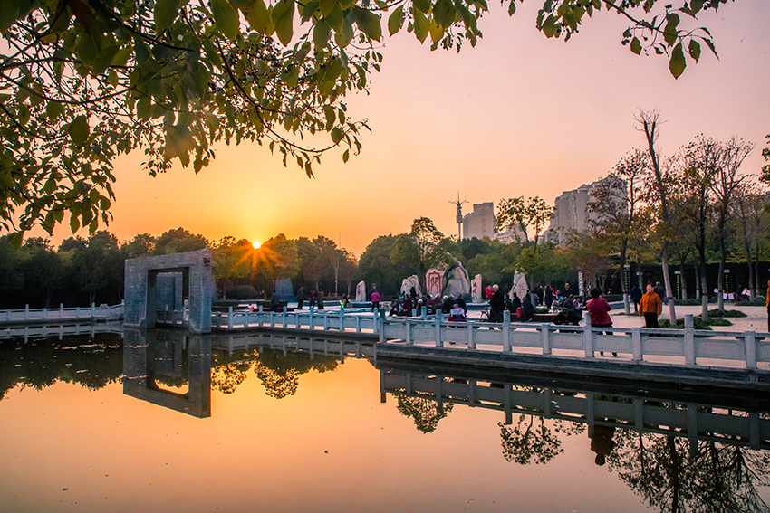 市民在南寨墙外广场上休闲娱乐(王天定文/图)