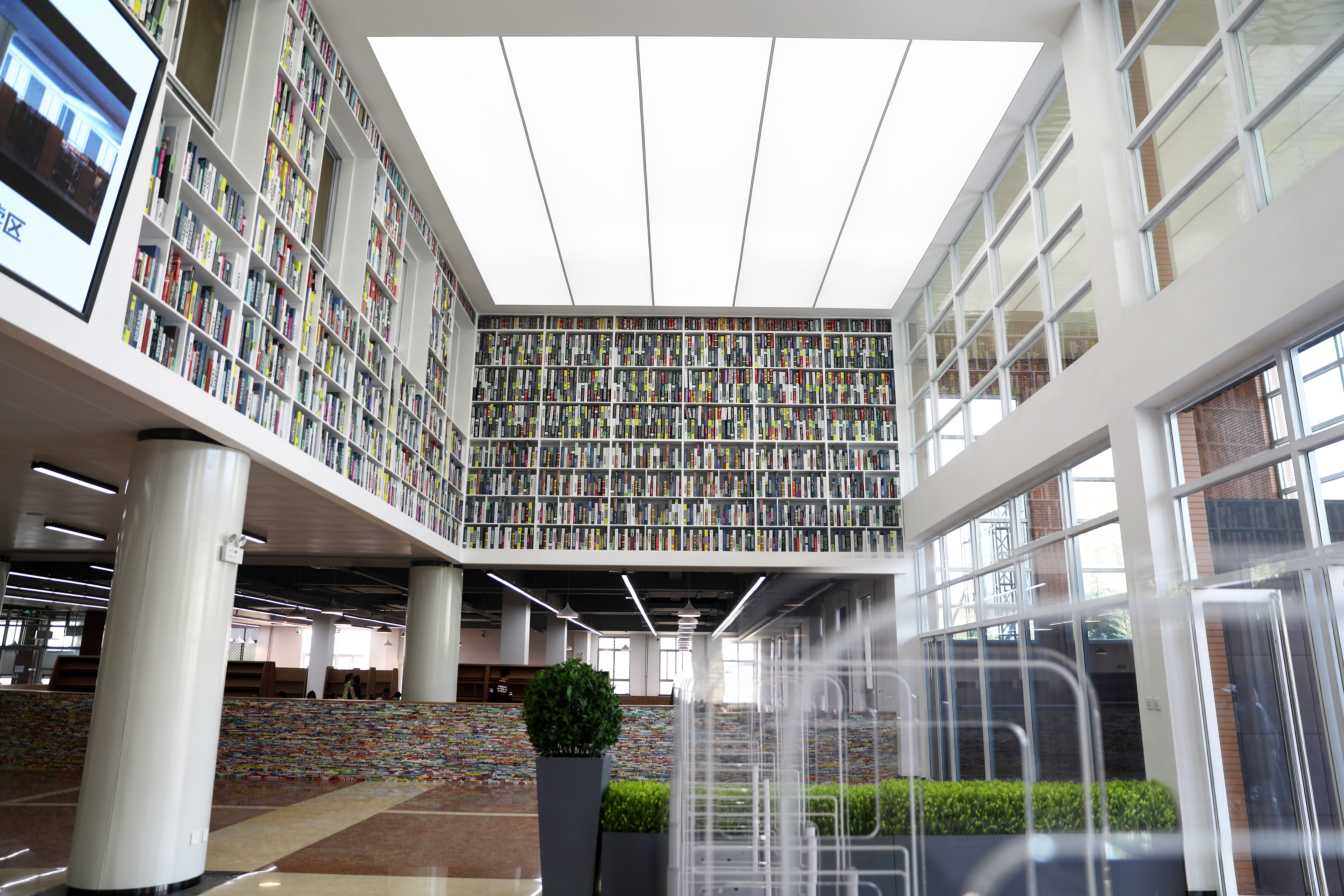 走进图书馆,首先看到的是“空中书架”,书架中间的“中央信息发布平台”能够更加直观、动态地展示借阅数据。