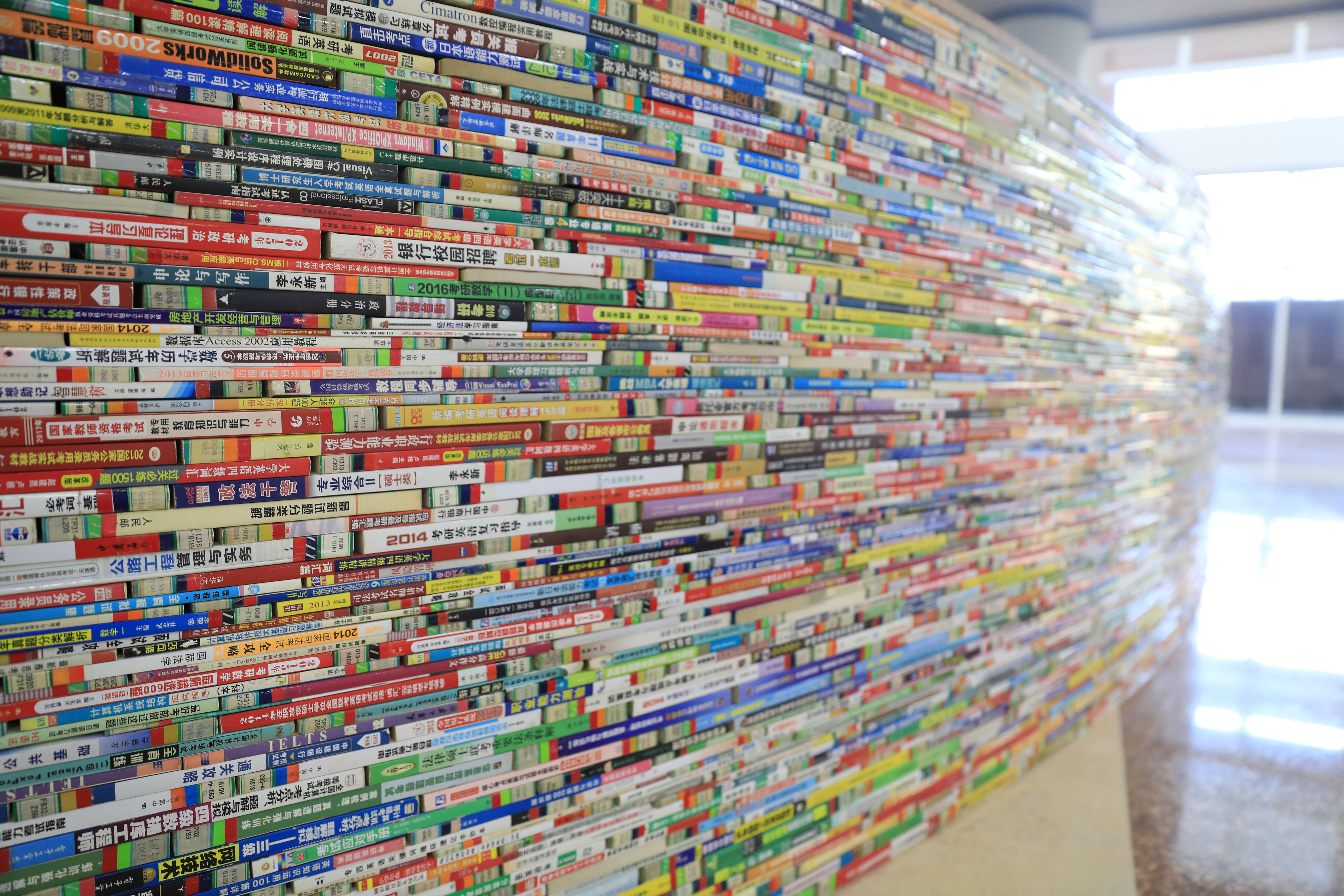 期刊阅览区的围墙由书堆砌而成,书籍皆为已被淘汰的考研考证类旧书,最长年限已经有30年之久。书墙内是期刊阅览区,展示的是当年的期刊和报纸。