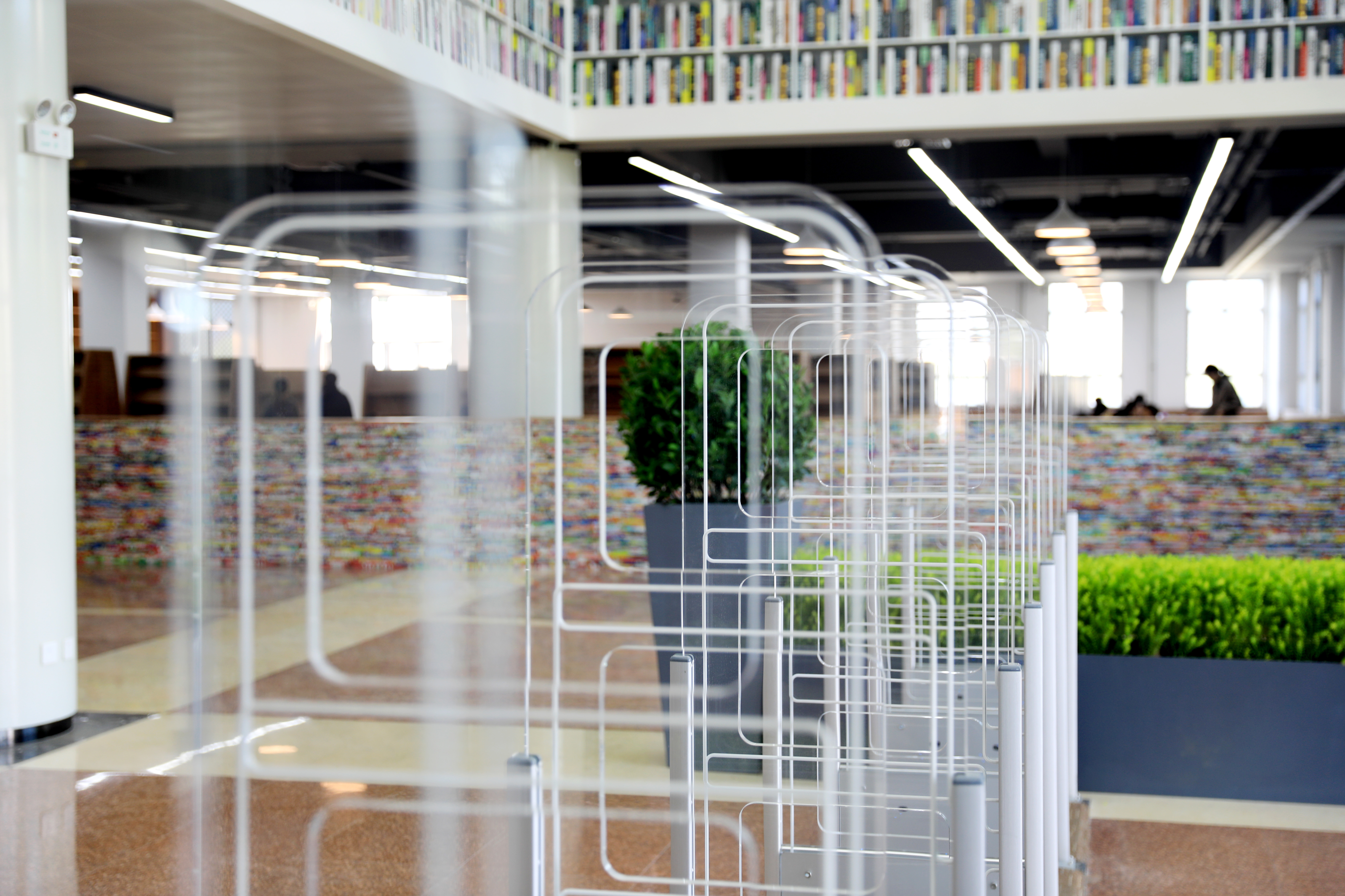 最吸引人眼球的就是“书海隧道”了,它的设计灵感源于阳光花房,寓意每一次阅读都是生命的一次光合作用,作为新书展区,内容不定期更新,分类清晰明确,便于读者在大厅就可选到优质图书。