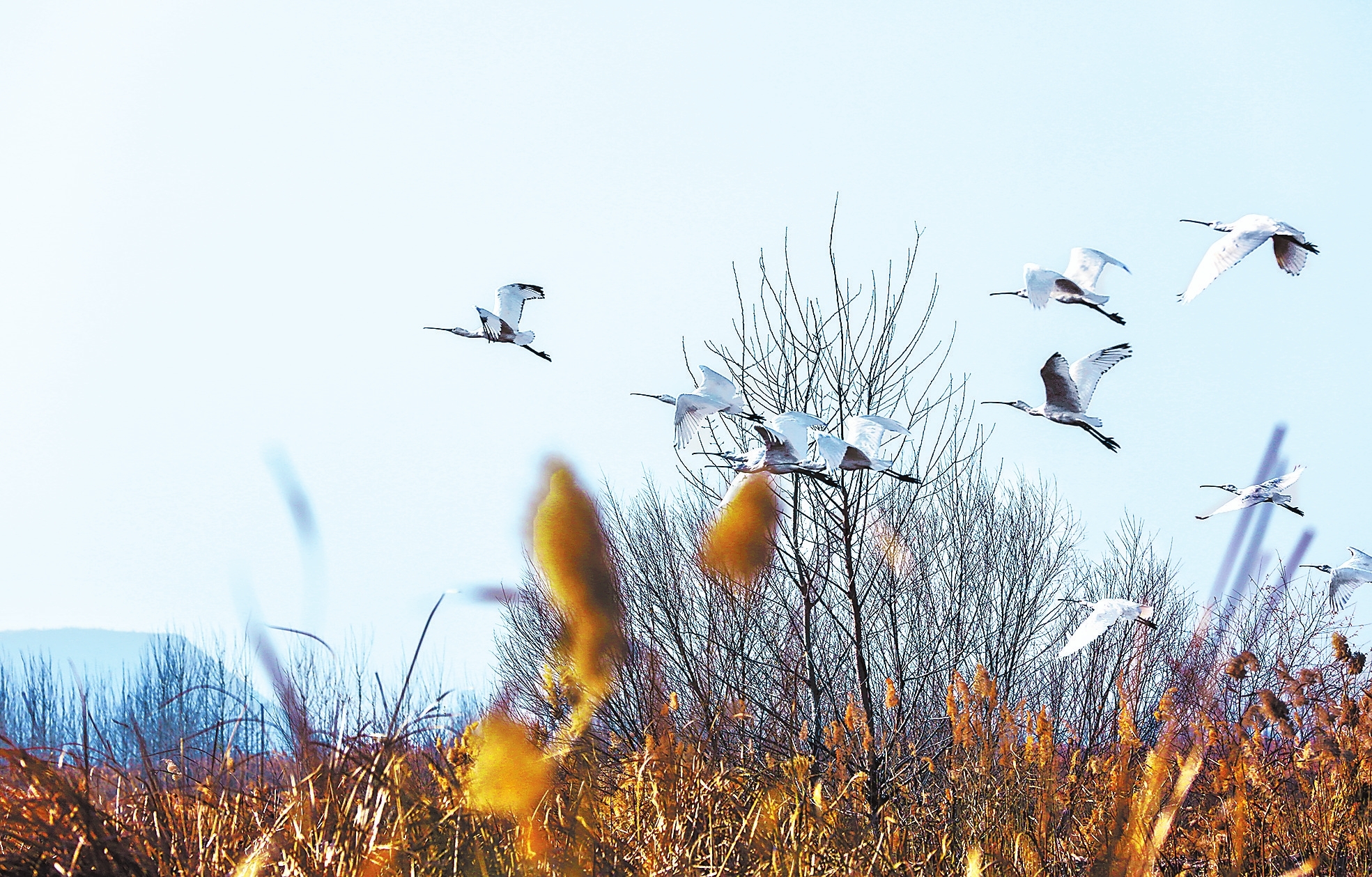 12月24日,在灵宝市西阎乡鼎湖湾黄河湿地,大白鹭、潜鸭、白琵鹭等候鸟正在栖息嬉水觅食,构成了一幅美丽的生态画卷。聂冬晗段景波摄
