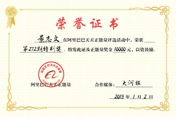1月2日下午,远在杭州的阿里巴巴天天正能量平台在大河客户端上看到“最美背影”的报道后,决定联合大河报授予景志文天天正能量第272期特别奖,及正能量奖金10000元。