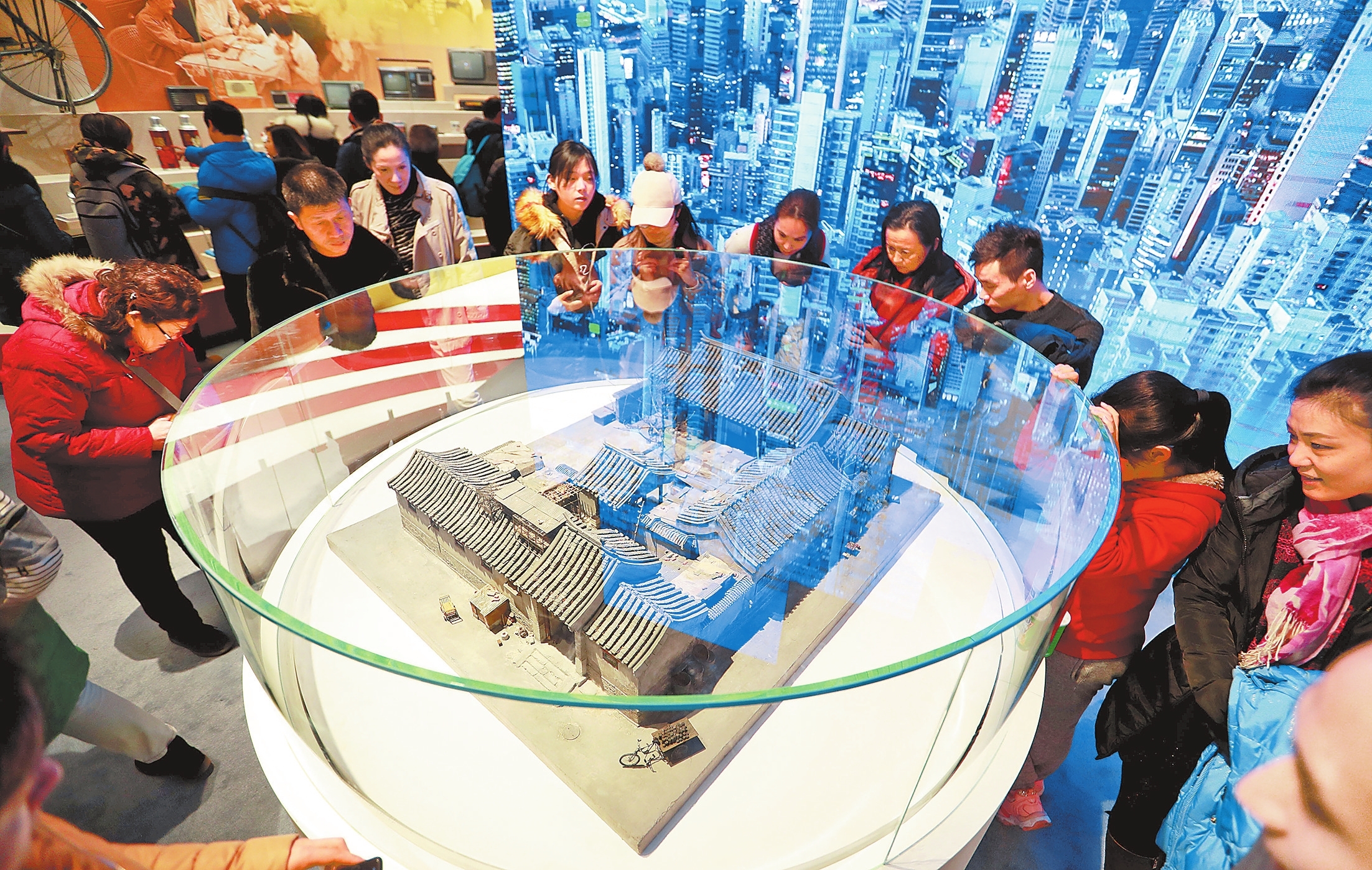 1月5日,观众在中国国家博物馆内观看一座重现老北京往日记忆的“四合院”微缩模型。截至当日,在中国国家博物馆举行的“伟大的变革——庆祝改革开放40周年大型展览”累计参观人数近250万人次。