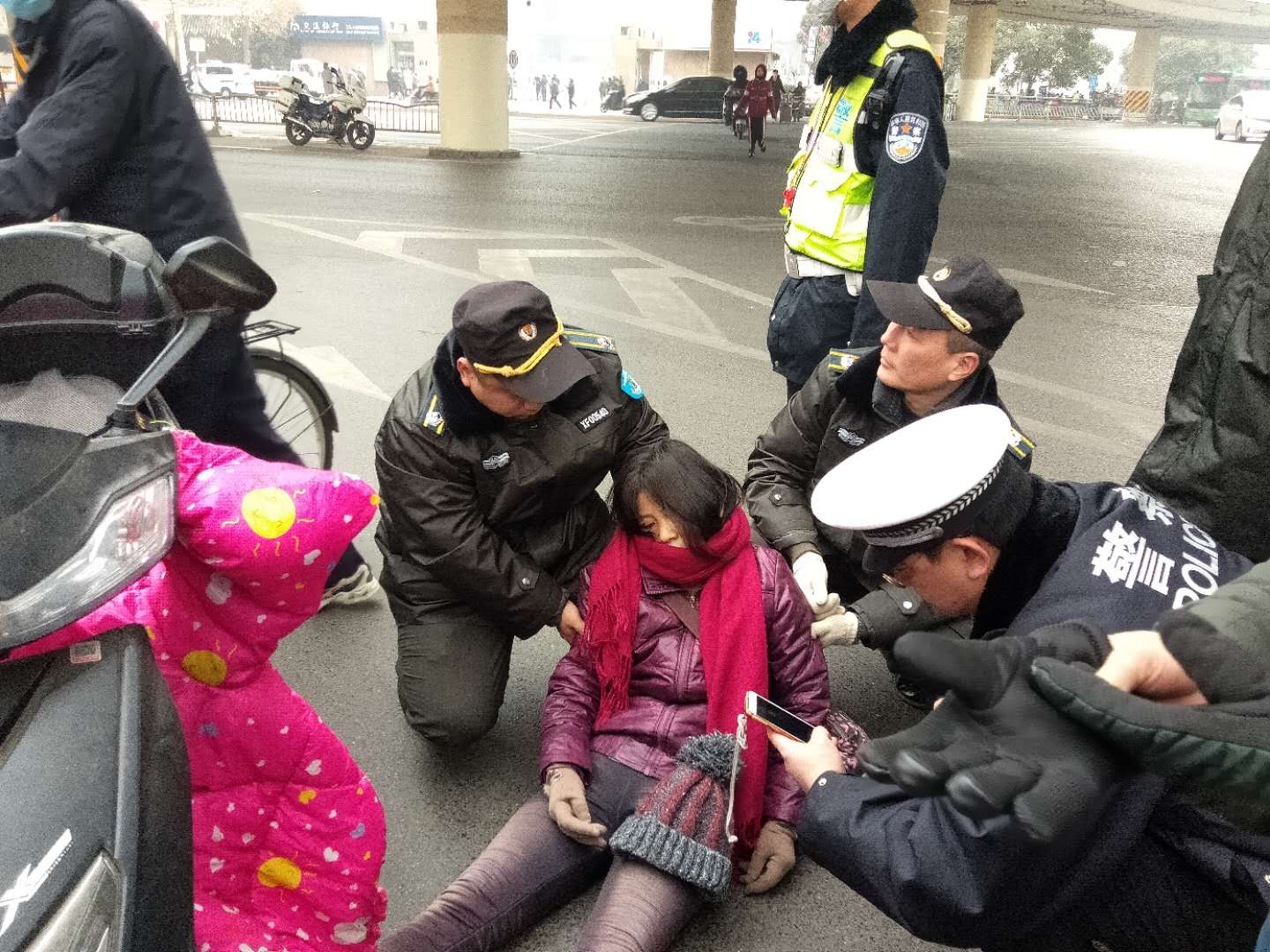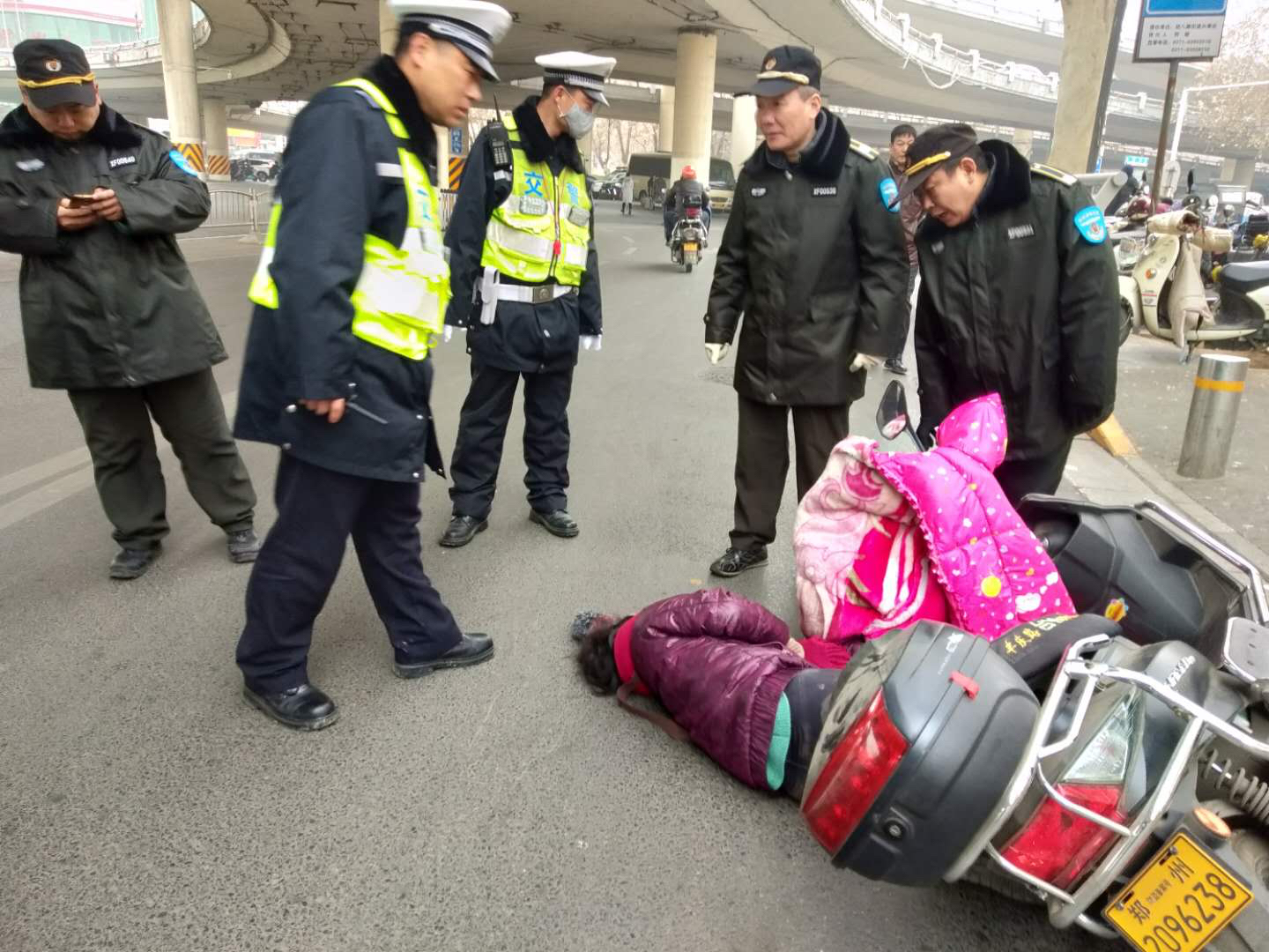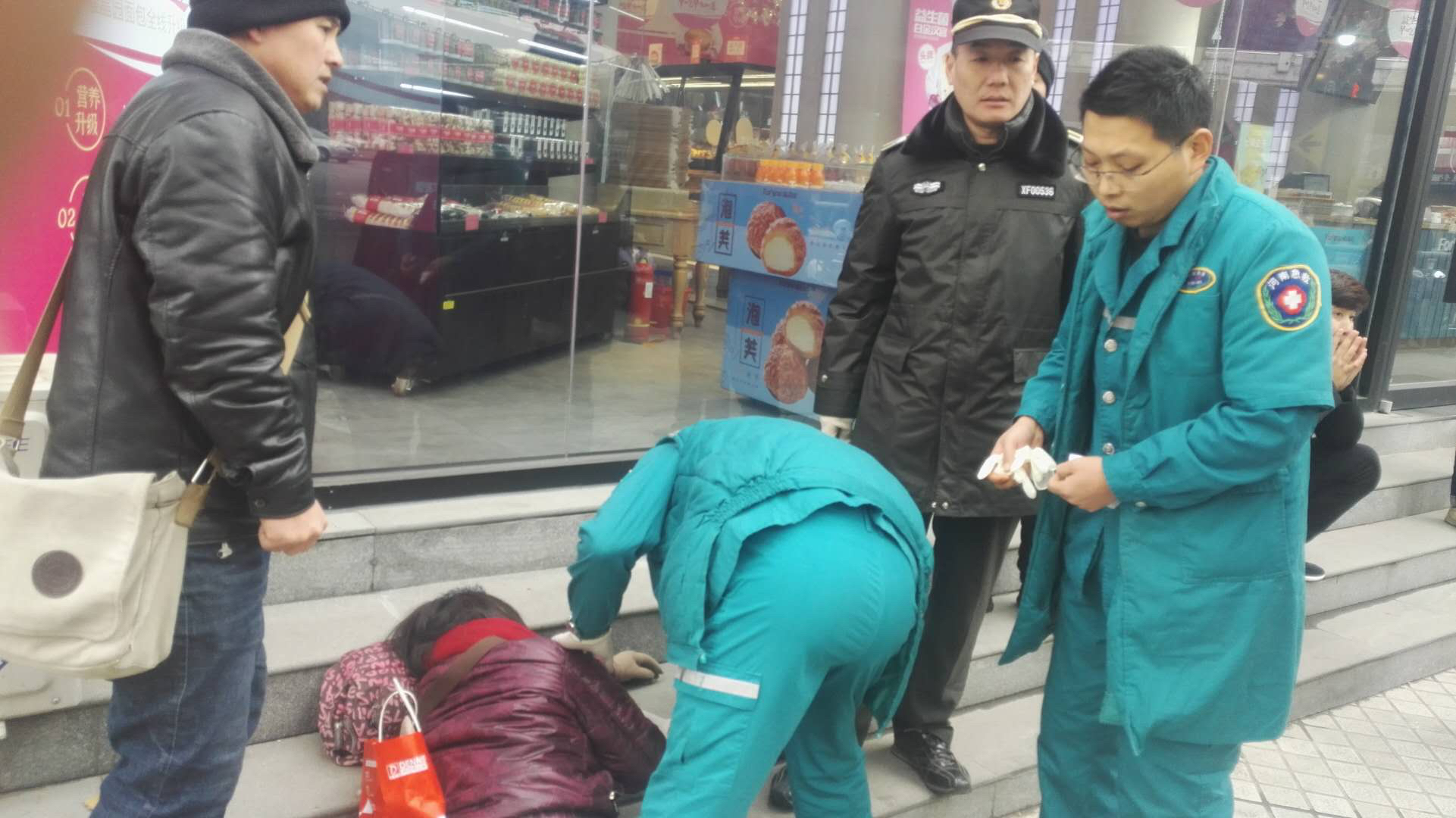 1月14日上午10时40分左右,郑州市金水区文化路办事处巡防队员李西友、雷文坡等人,正在花园路与金水路交叉口执勤时,看到一名女子骑电动车经过路口西北角时,突然摔倒在地上,昏迷不醒。