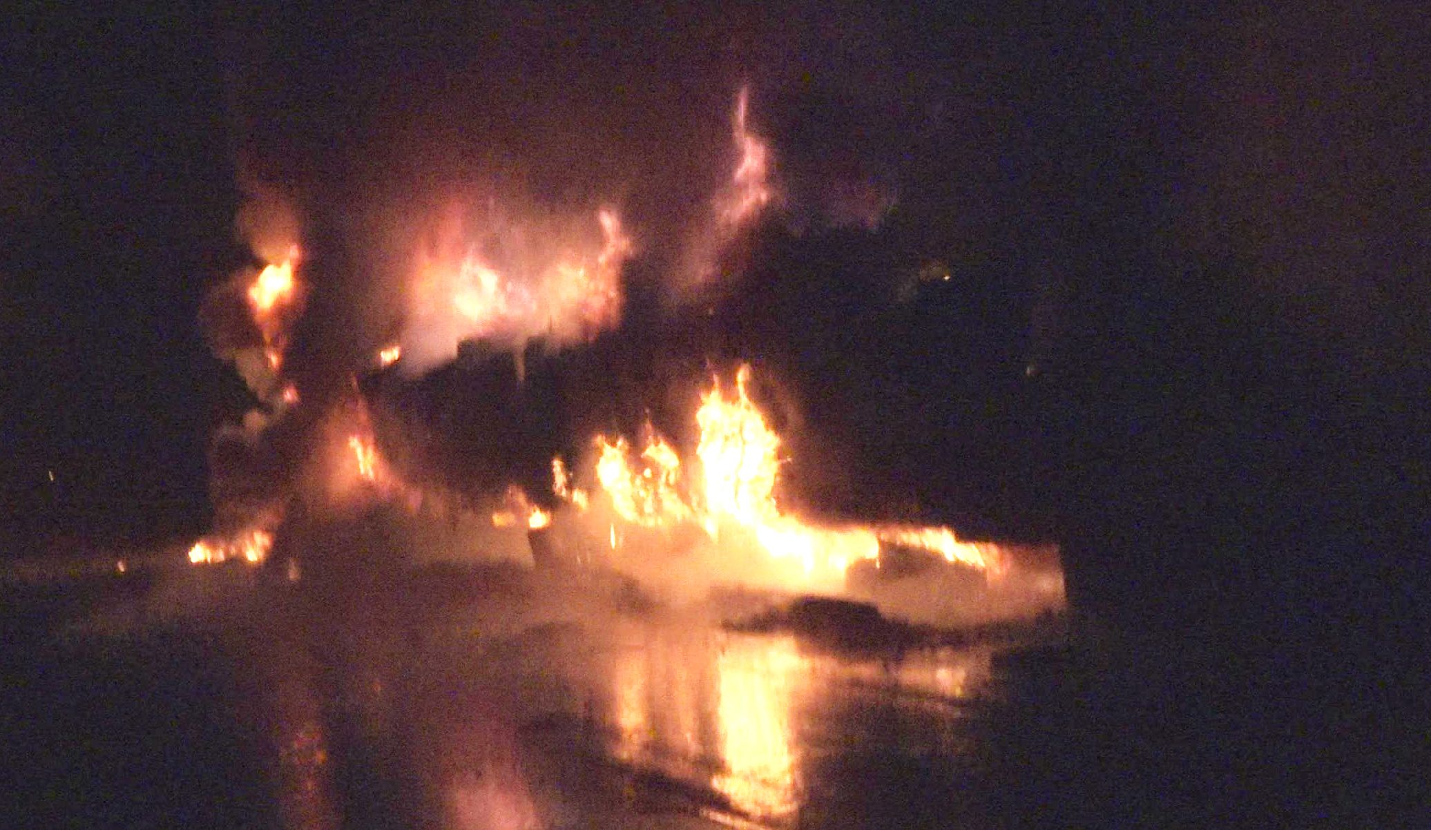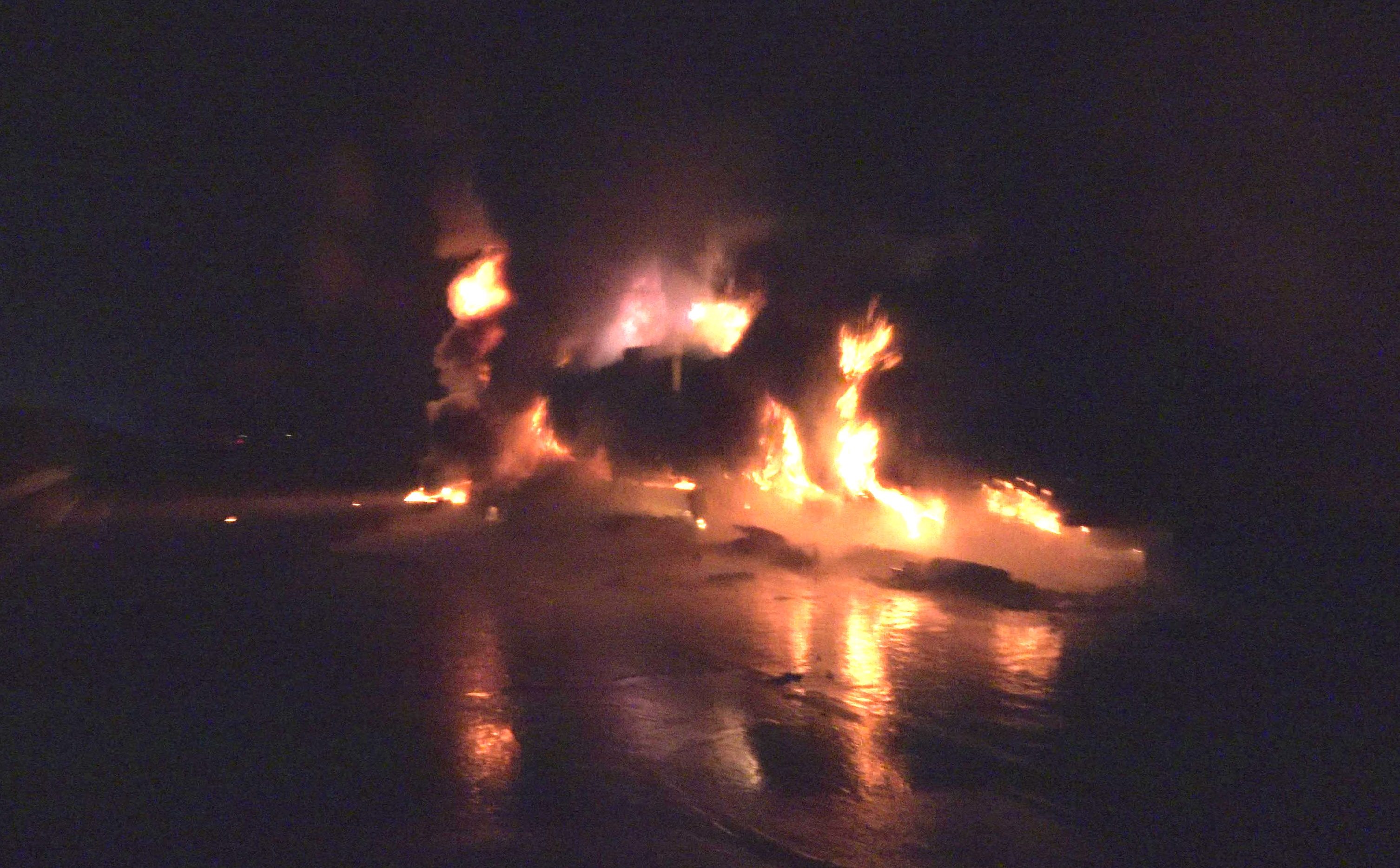 当晚7时21分,尉氏县消防救援大队接到报警后,立即调集北三环中队、工业路中队5辆消防车疾驰事发地点。赶到现场后,消防员看到一辆拖挂货车正处在猛烈燃烧阶段,20米长的货车全部被引燃,宛如如一条“火龙”。货车上的空调在烈焰中不时发出砰砰的爆炸声,让过往车辆纷纷避让,情况危险。